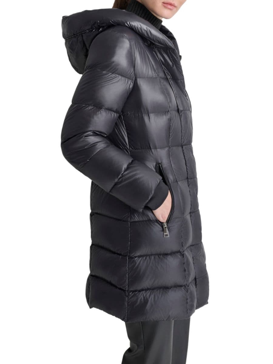 DKNY предлагает пуховик средней длины из лёгкого нейлона. Модель имеет прикреплённый капюшон на шнурке, длинные рукава и два кармана на молнии спереди.