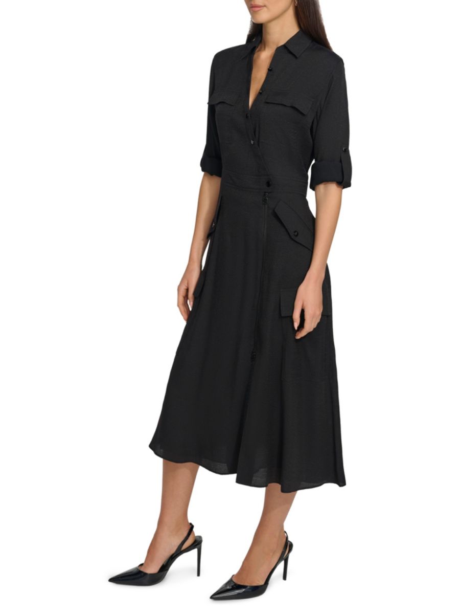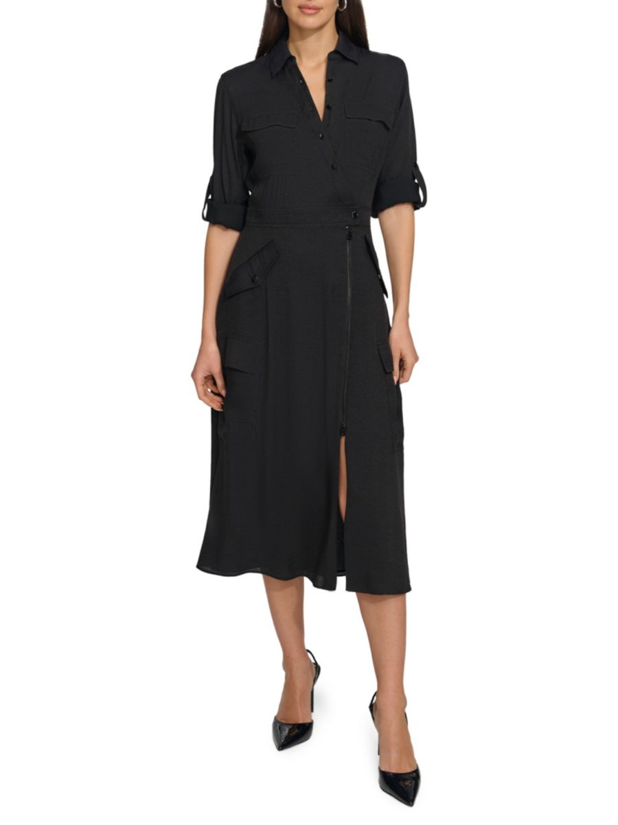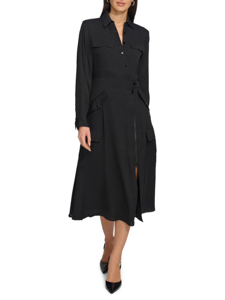Шелковистое платье-карго миди с длинными рукавами DKNY, черный
