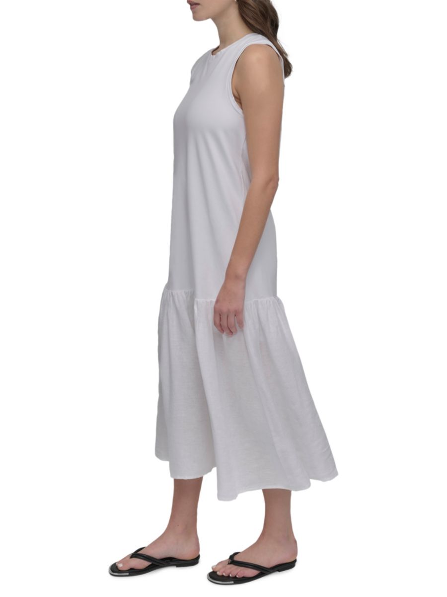 Это платье миди без рукавов сочетает в себе гладкий трикотажный лиф и фактурную тканую юбку. Свободный крой дополнен заниженной линией талии и возможностью застегнуть платье.