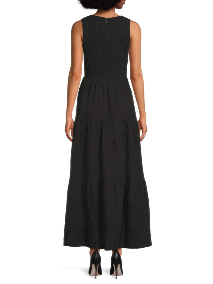 Это платье макси без рукавов выполнено из легкого и дышащего хлопка, дополненного многоярусными сборками.