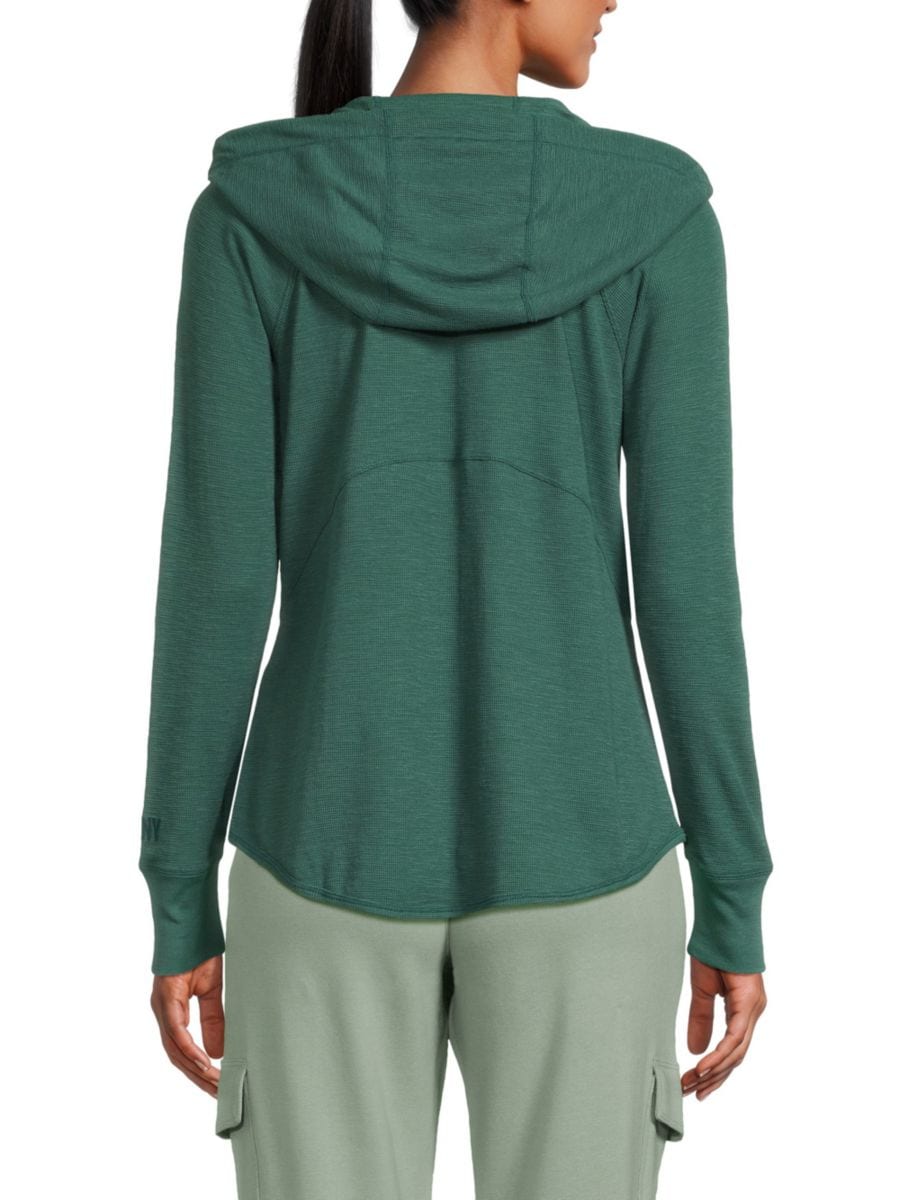 DKNY Sport представляет укороченную куртку из гладкой ткани с пришитым капюшоном на липучке. Длинные рукава реглан, манжеты на резинке и прорезные карманы-кенгуру.