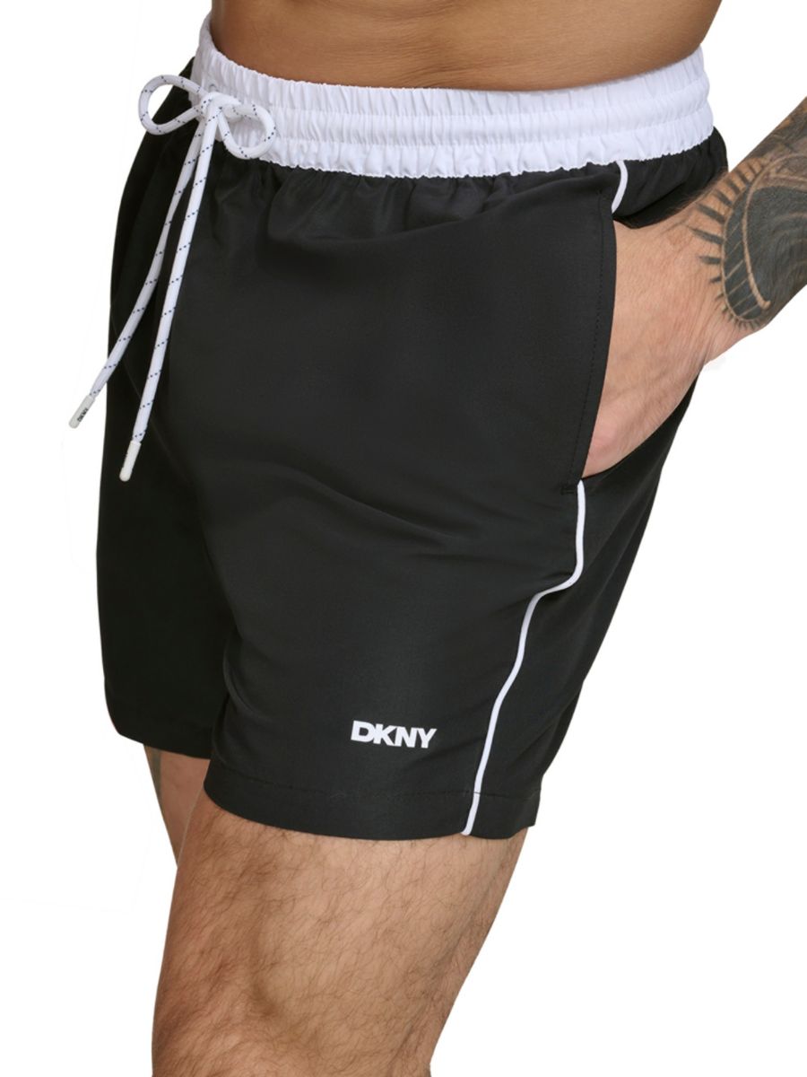 Эти плавки-шорты DKNY с гладкой поверхностью и эластичным поясом на шнурке. Благодаря боковым накладным карманам и карману с клапаном сзади, они создают четкий, приталенный силуэт.