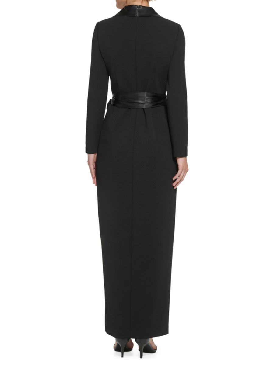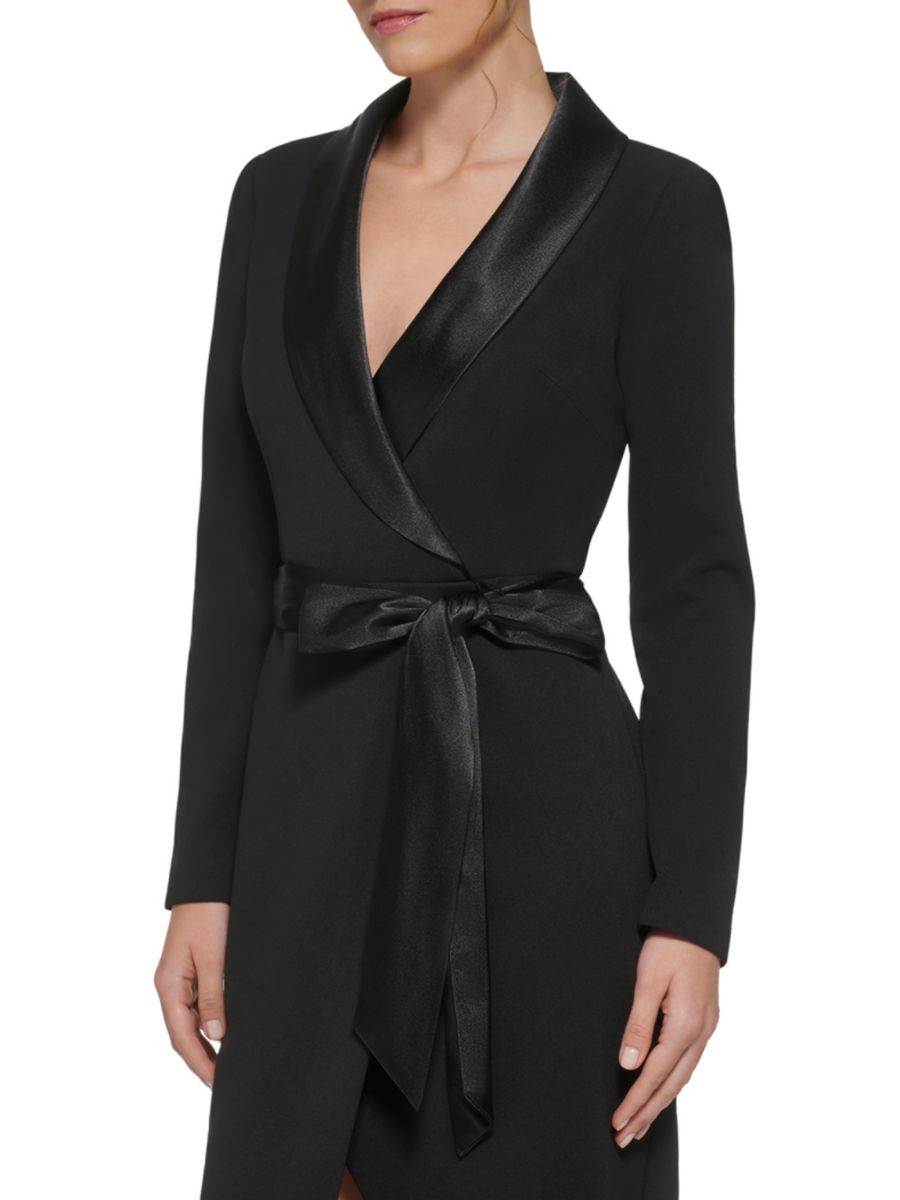 Элиза Джей представляет платье в стиле смокинга из структурированной ткани с шалевыми отворотами и длинными рукавами. Облегающий силуэт подчеркивается завязками на талии.