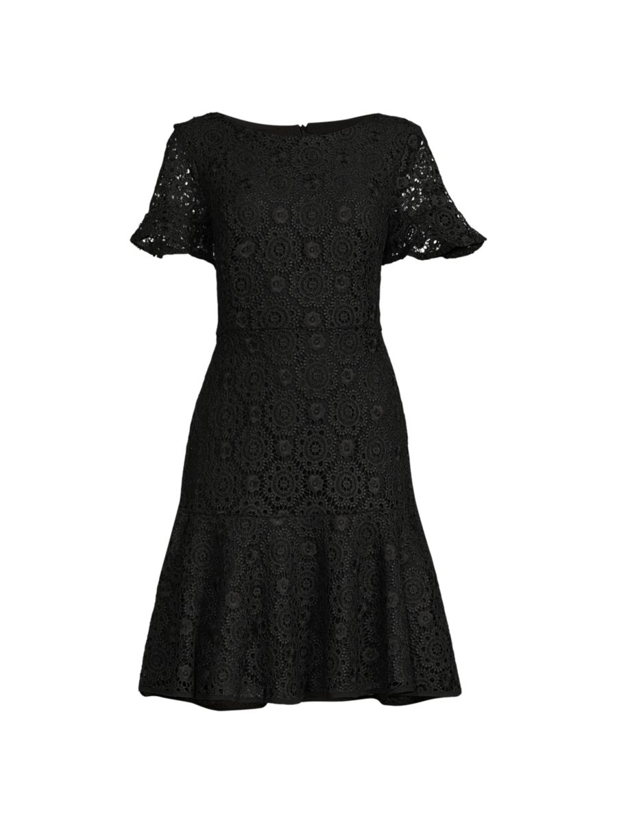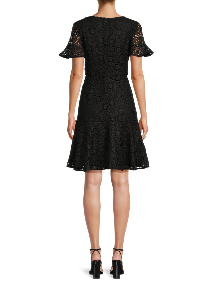Это классическое кружевное платье с вырезом лодочкой, расклешенными манжетами и замысловатыми вышитыми мотивами отлично подойдет для создания скромного женственного образа.