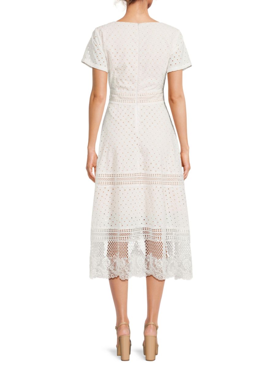 Игривый кружевной подол добавляет женственности этому шикарному миди-платью с вышивкой из люверсов.