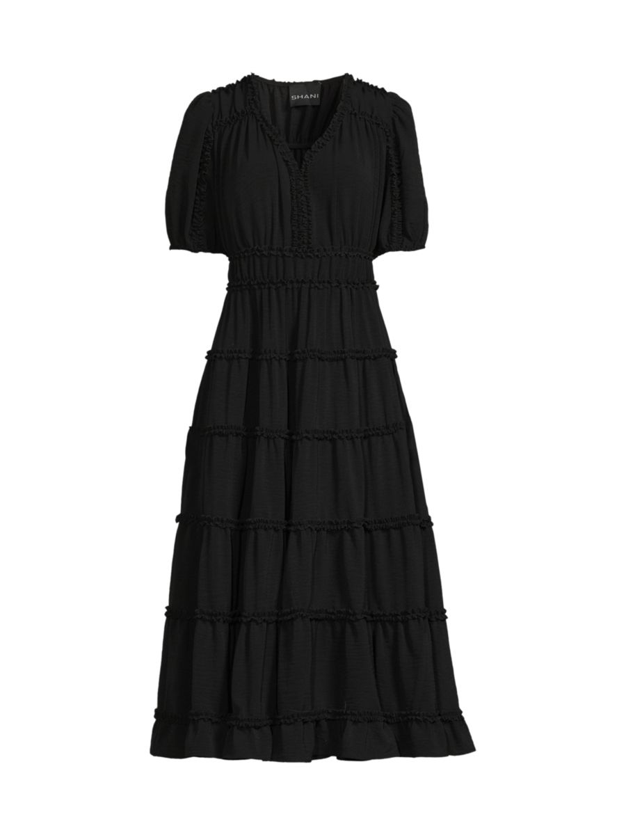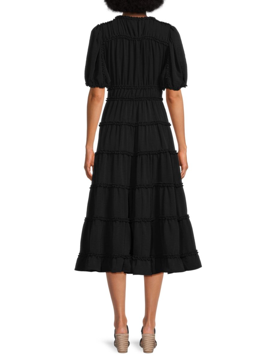 Это платье миди, скроенное по фигуре, с расклешенным кроем, украшено оборками и многоуровневым покроем.