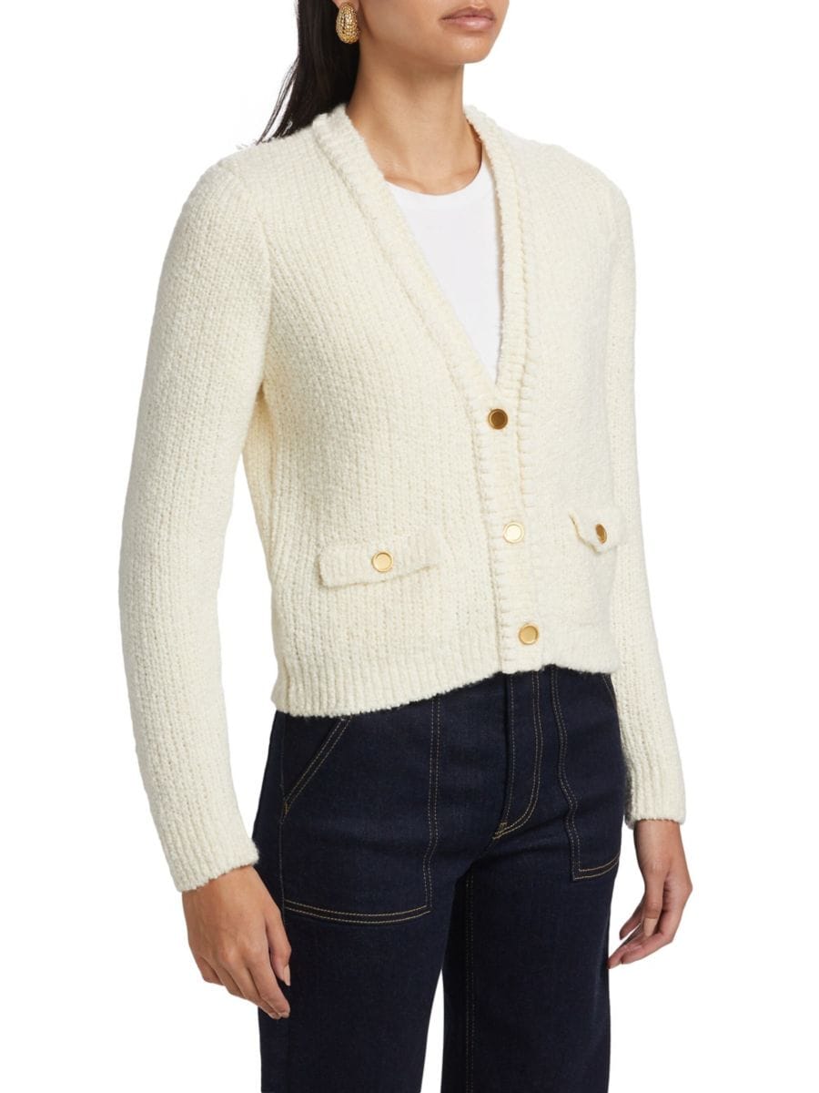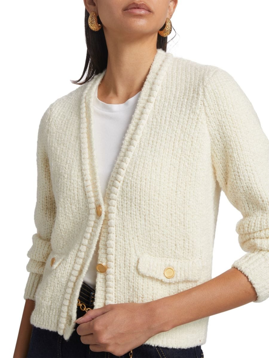 Этот укороченный кардиган Frame текстурированной вязки выполнен из шерсти и дополнен двумя карманами с клапанами и золотистой фурнитурой.