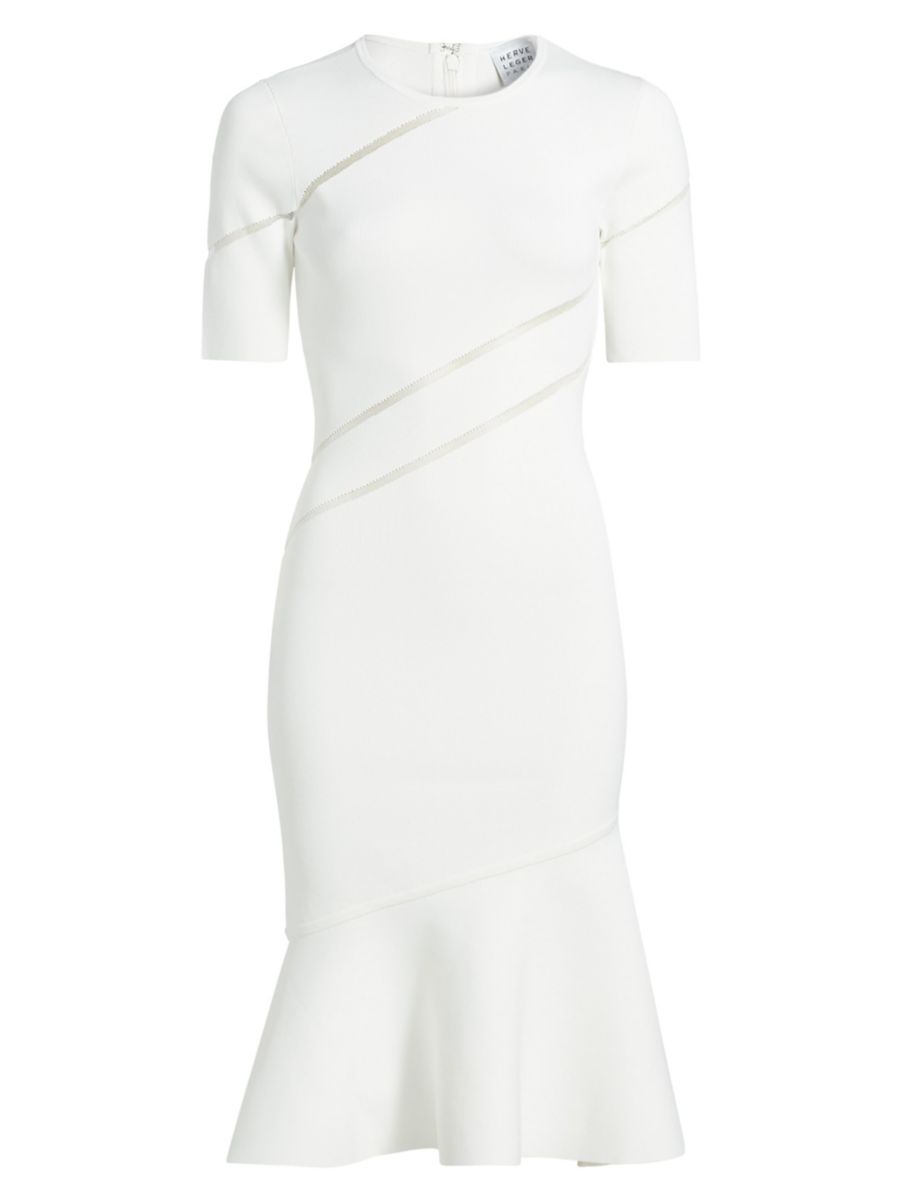 Платье Beth от Hervé Léger с короткими рукавами, прозрачными полосками и рифленым подолом. Приталенный силуэт с классическим круглым вырезом.