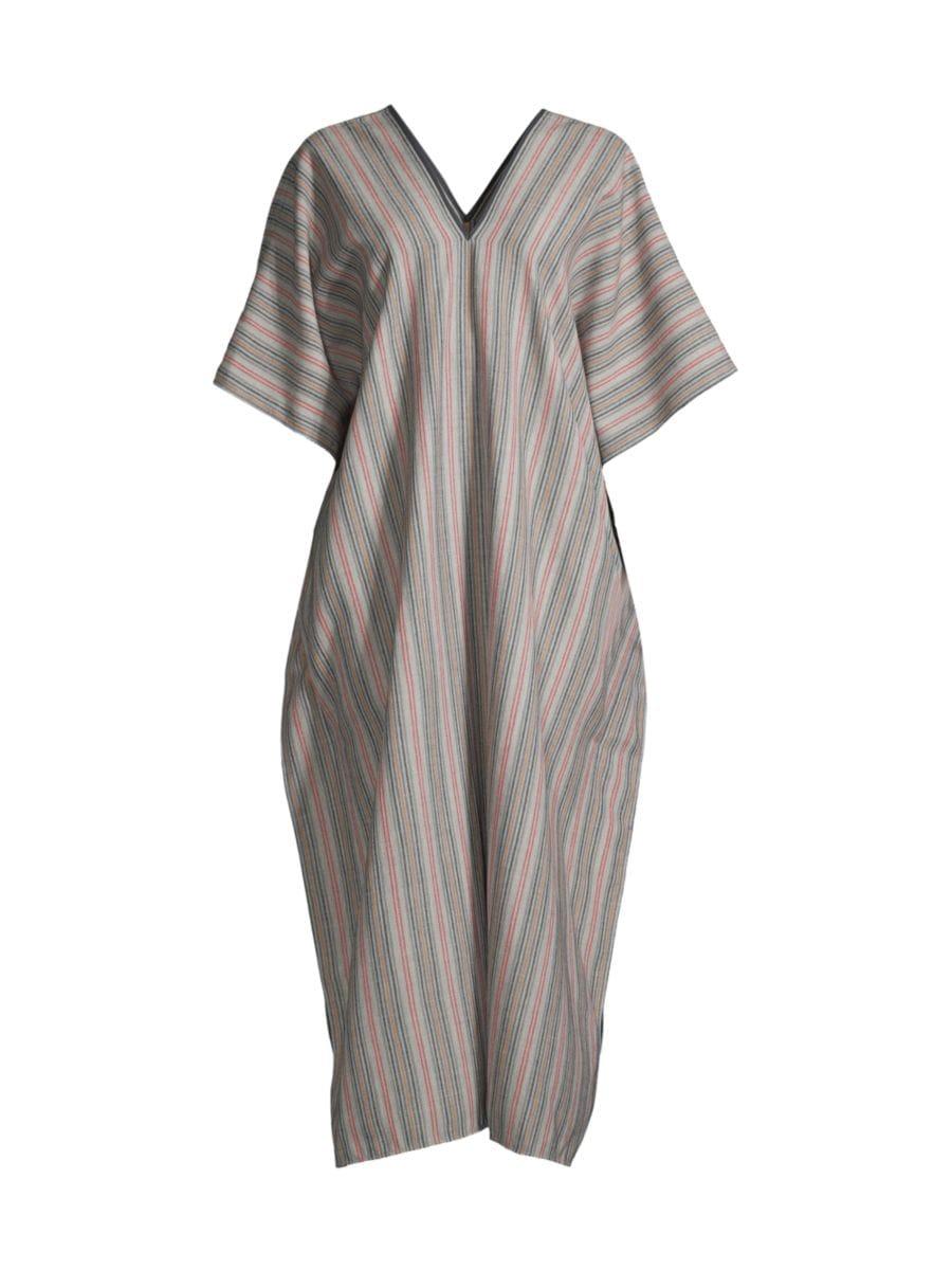 Свободное платье-кафтан с разноцветными полосками и разрезом по низу.