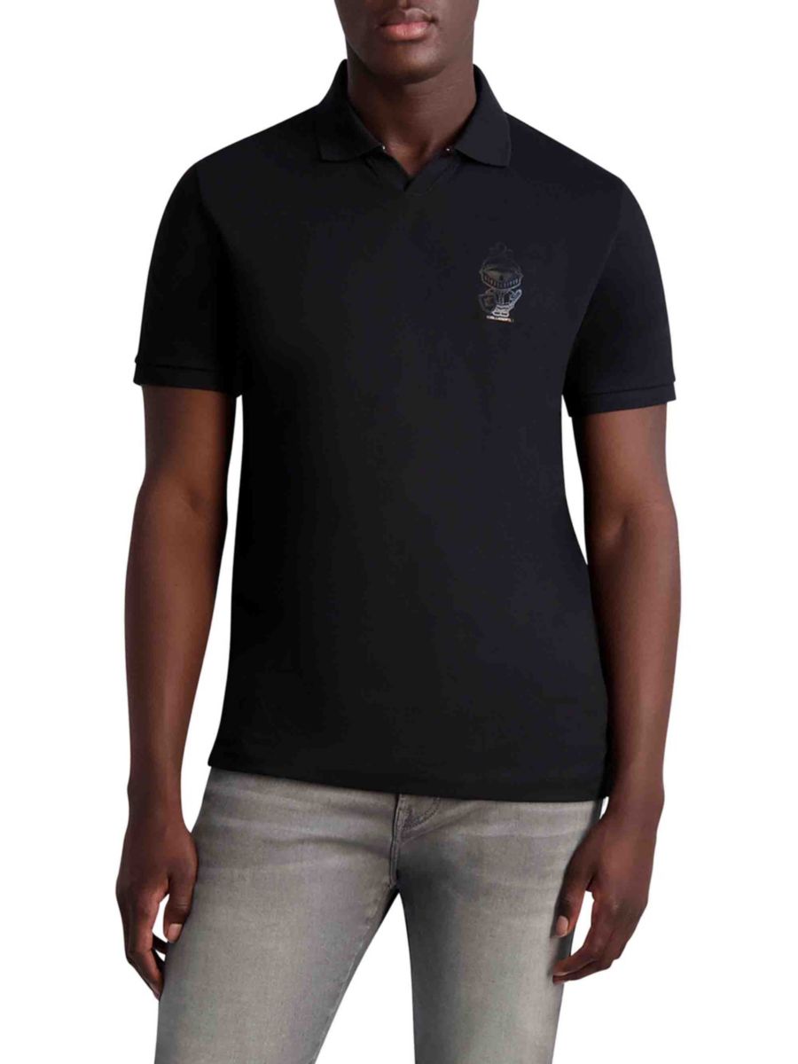 Рубашка-поло Karl Lagerfeld Paris сшита из хлопкового пике и имеет короткий воротник-стойку Johnny. На груди изображен рыцарь.