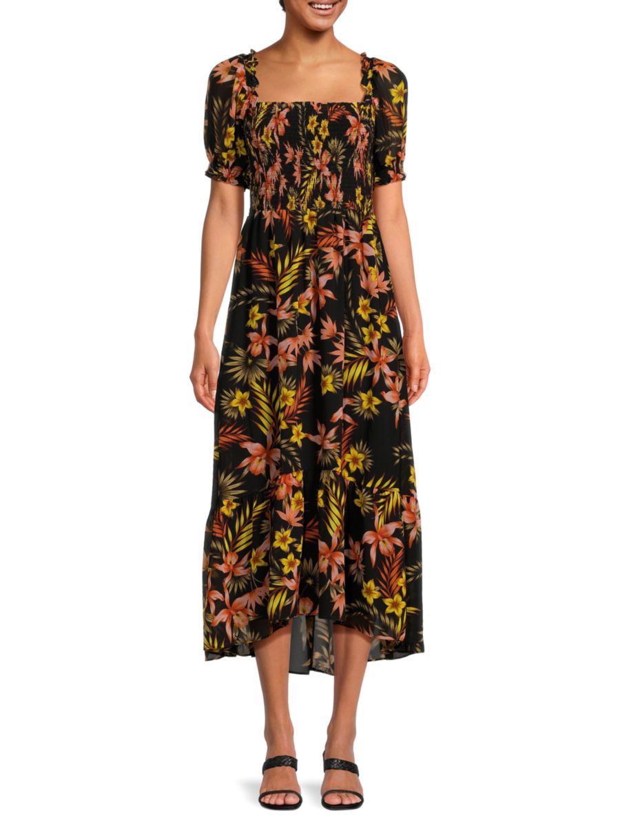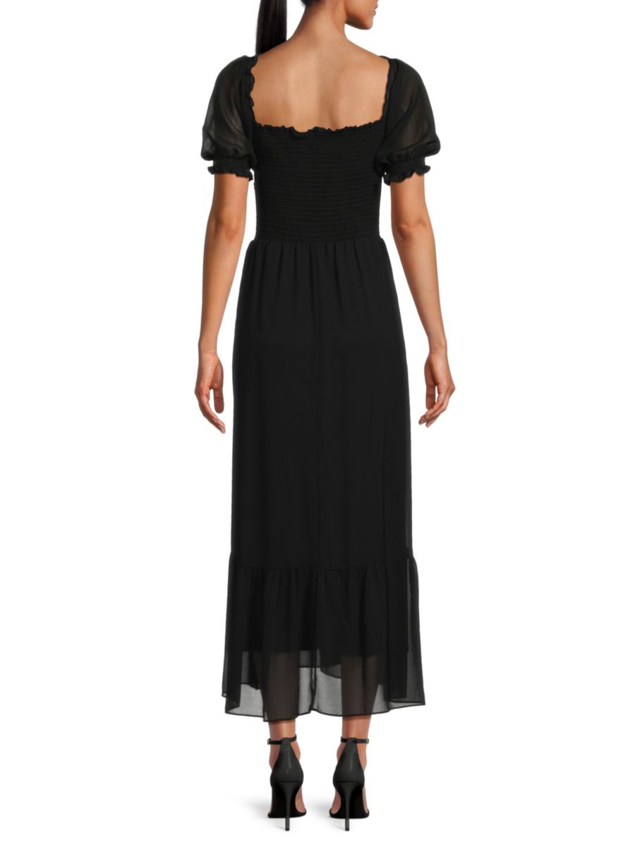 Это платье миди от Karl Lagerfeld Paris с присборенным лифом и квадратным вырезом. Короткие рукава с эластичными манжетами и многоярусная юбка с оборками.