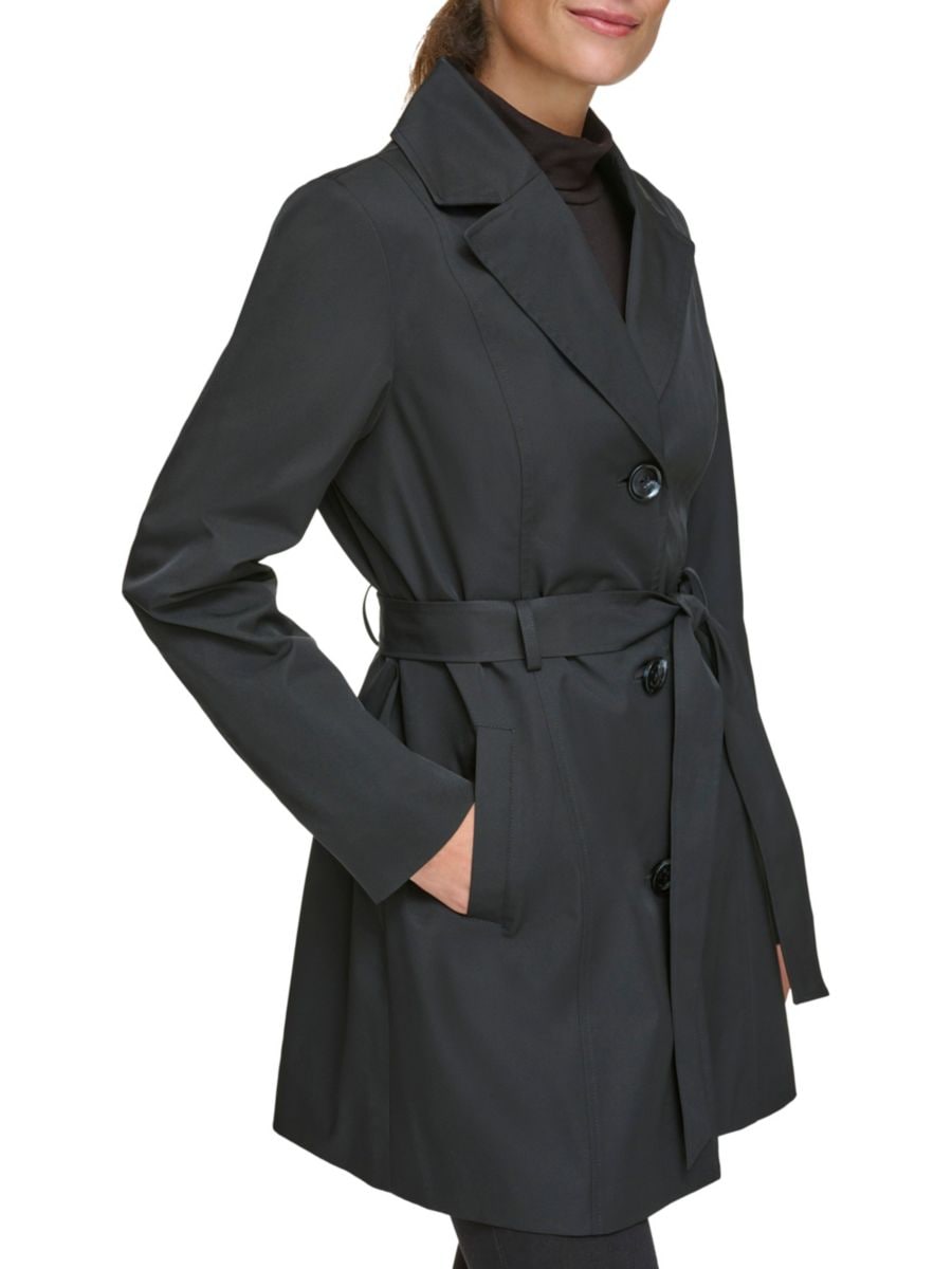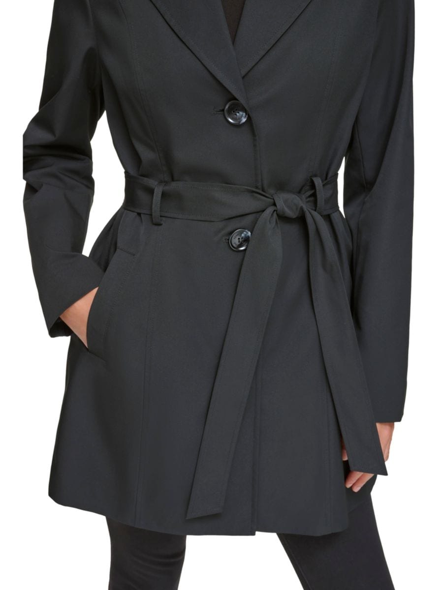 Этот классический тренчкот от Kenneth Cole имеет однобортный перед и завязывающийся пояс, который подчеркивает талию.