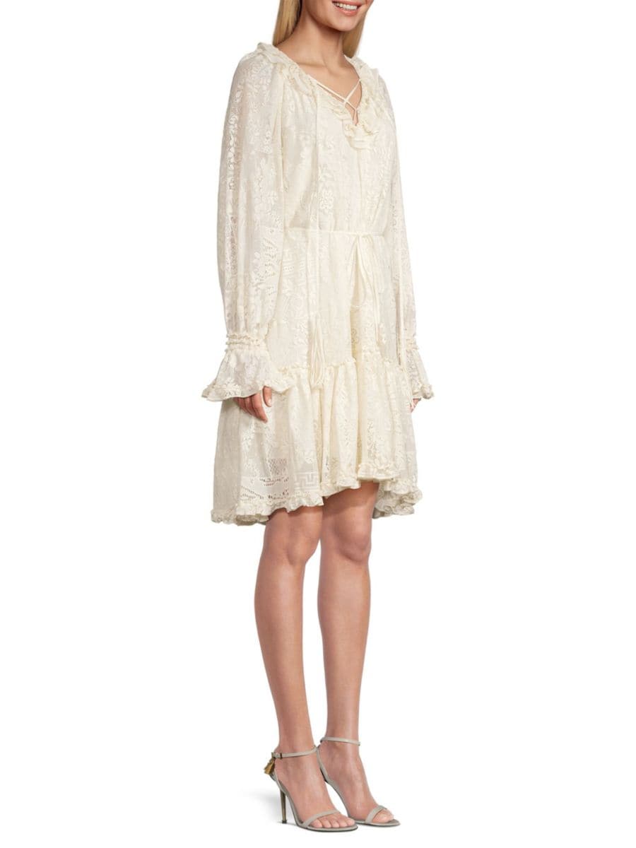 Платье с длинными рукавами от Kobi Halperin, выполненное из хлопковой смеси, выполнено из дышащего цветочного кружева и дополнено завязкой на шее.