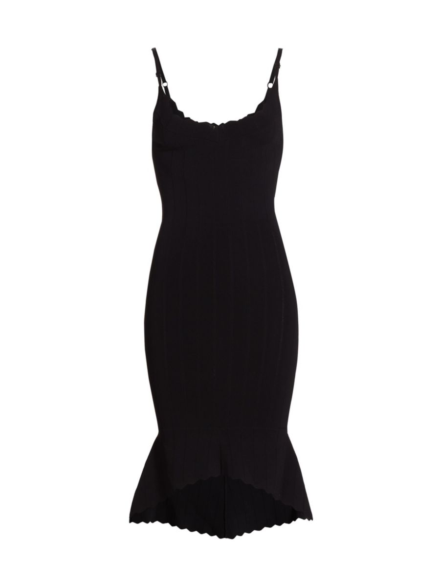 Платье Asa от L'AGENCE выполнено в рубчик и дополнено фестончатым круглым вырезом и асимметричным подолом.