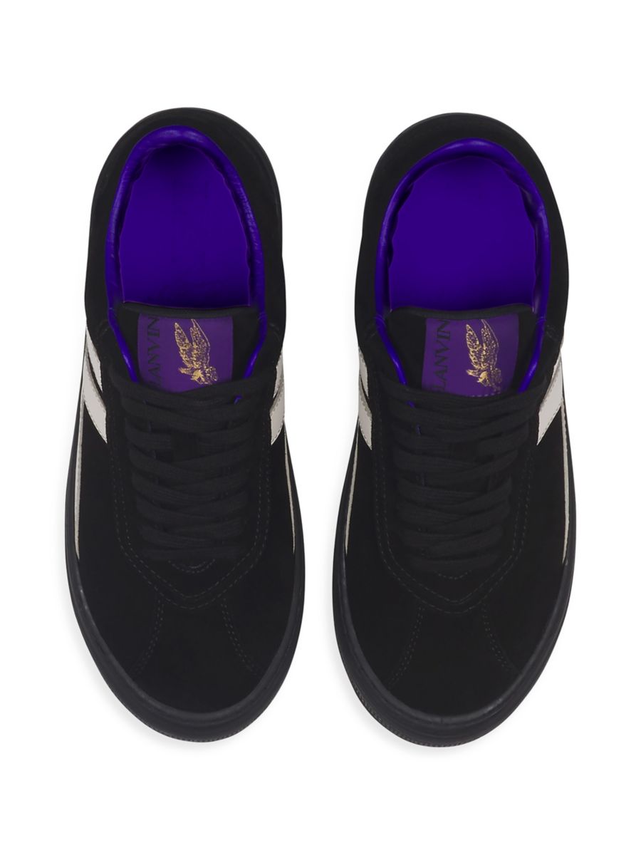 Эти кроссовки Cash, ставшие результатом сотрудничества Lanvin Lab и Future, переосмысливают классические низкие модели в смелом городском стиле. Модель выполнена из гладкой кожи с контрастной вставкой с логотипом JL, дополнена фиолетовой текстильной подкладкой и рельефной подошвой в тон, что делает её идеальной для улицы.