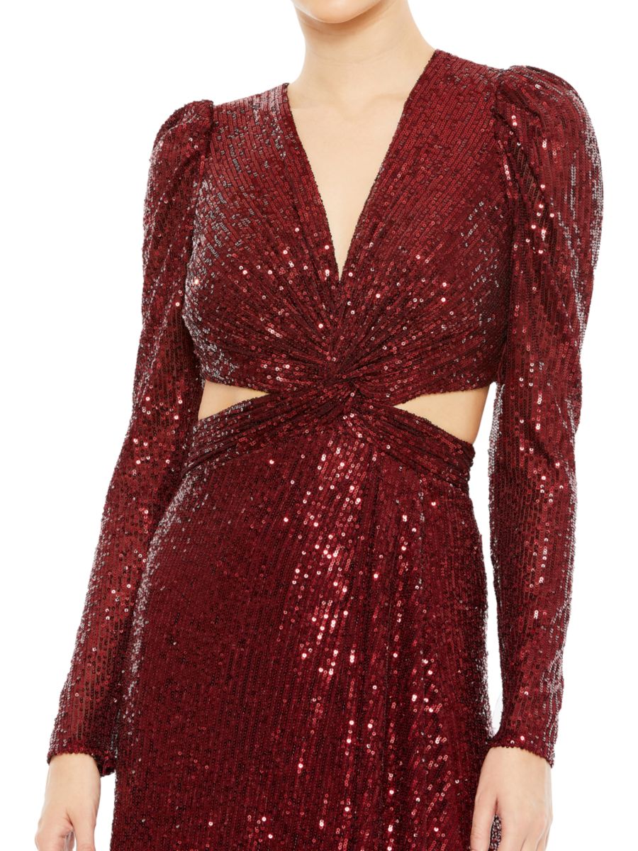 Потрясающее платье, расшитое пайетками, с закрученным узлом спереди и асимметричным подолом.