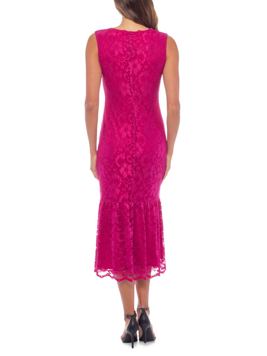 Платье миди из кружева Marina с V-образным вырезом и фестончатым лифом без рукавов. Приталенный силуэт с расклешенной юбкой обеспечивает грациозность движений, а изысканный кружевной верх подчеркивает женственность.