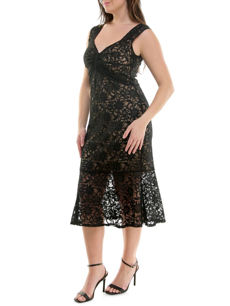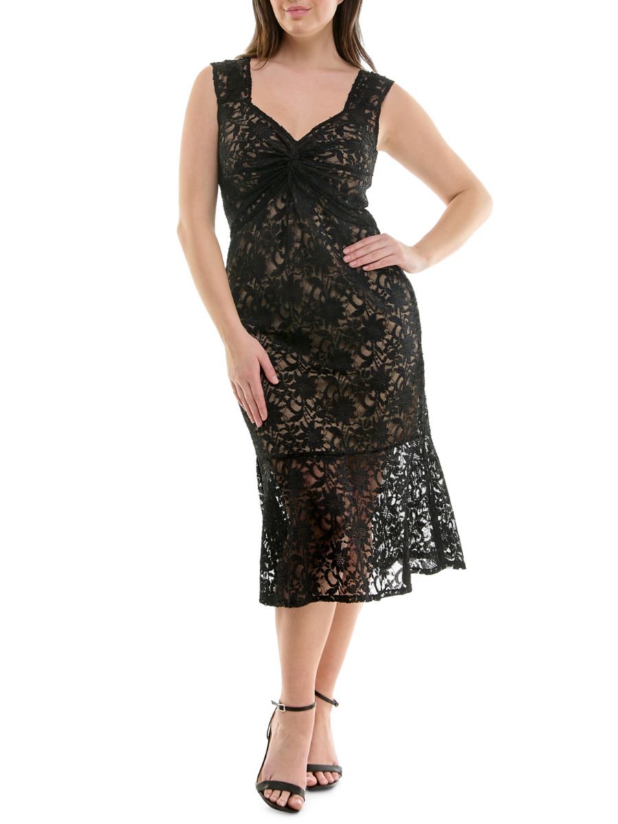 Платье Lucy длиной до колена от Nicole Miller, выполненное из эластичного кружева, имеет вырез сердечком, обеспечивающий облегающую посадку с полурасклешенной юбкой.