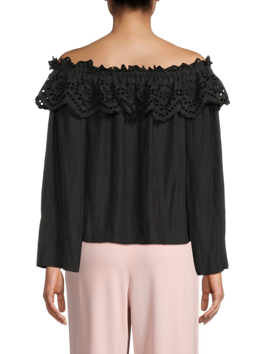 Этот топ DKNY с открытыми плечами дополнен широким оборчатым вырезом, украшенным вышивкой с люверсами. Длинные рукава и свободный крой дополняют воздушный образ.