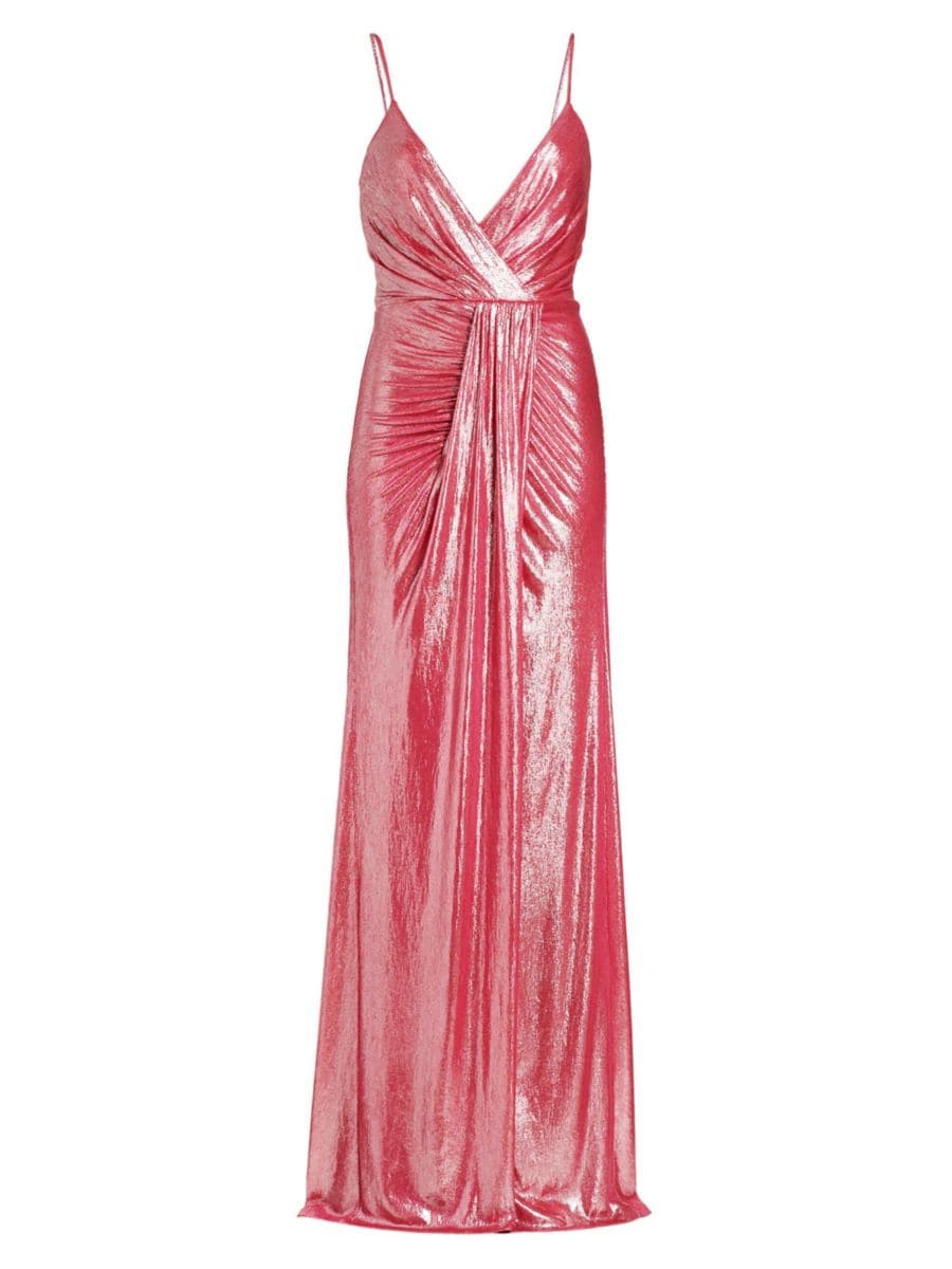 Вечернее платье Kade от Ramy Brook с вырезом-сюрпризом и драпировкой по центру поверх юбки-пачки. Длина платья до пола дополнена блестящей металлической отделкой.