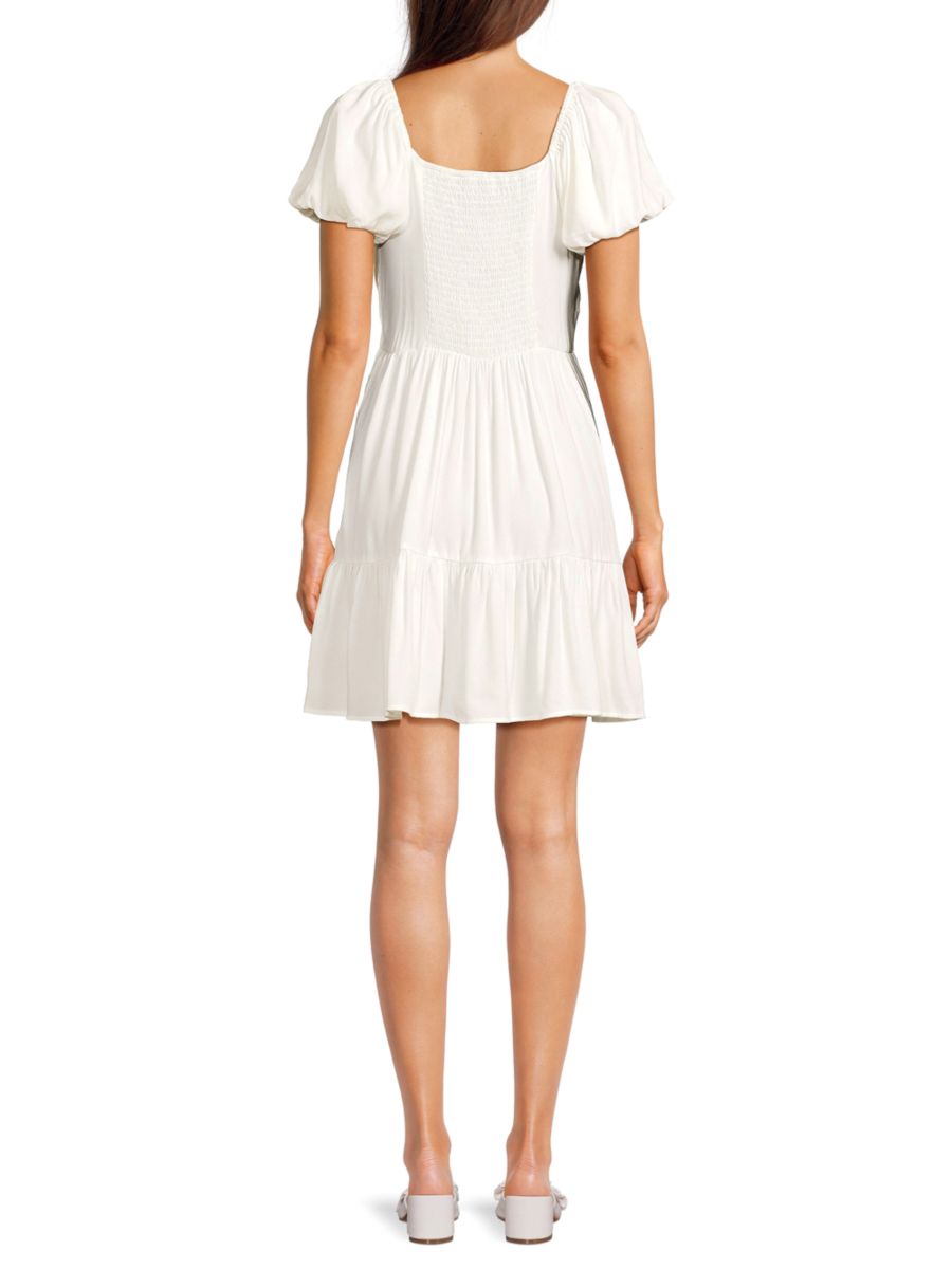 Приталенный силуэт с расклешенной юбкой придает мягкие формы этому мини-платью RD Style с V-образным вырезом, многоярусной юбкой и короткими рукавами-буфами.