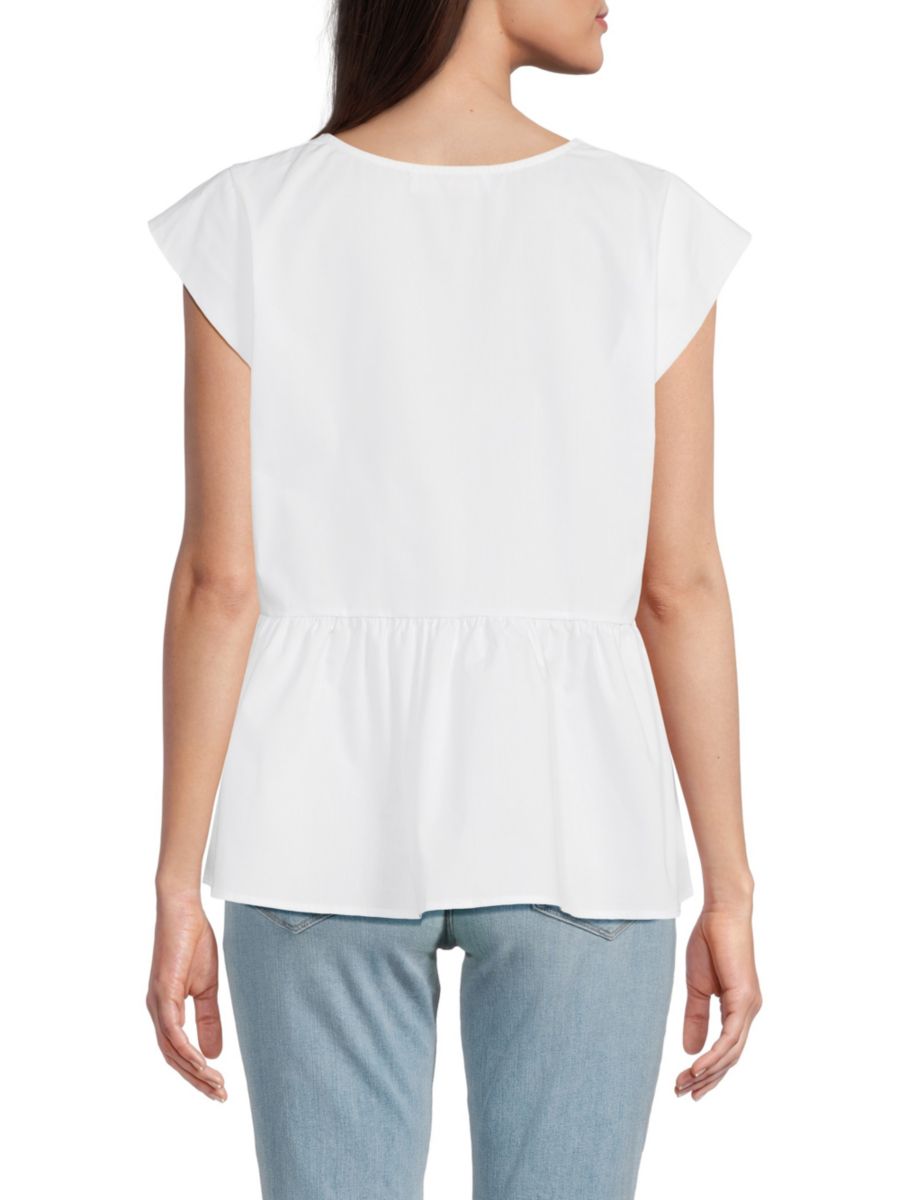 Обновите свой базовый гардероб этим сдержанным топом с оборкой по низу и рукавами-крылышками.