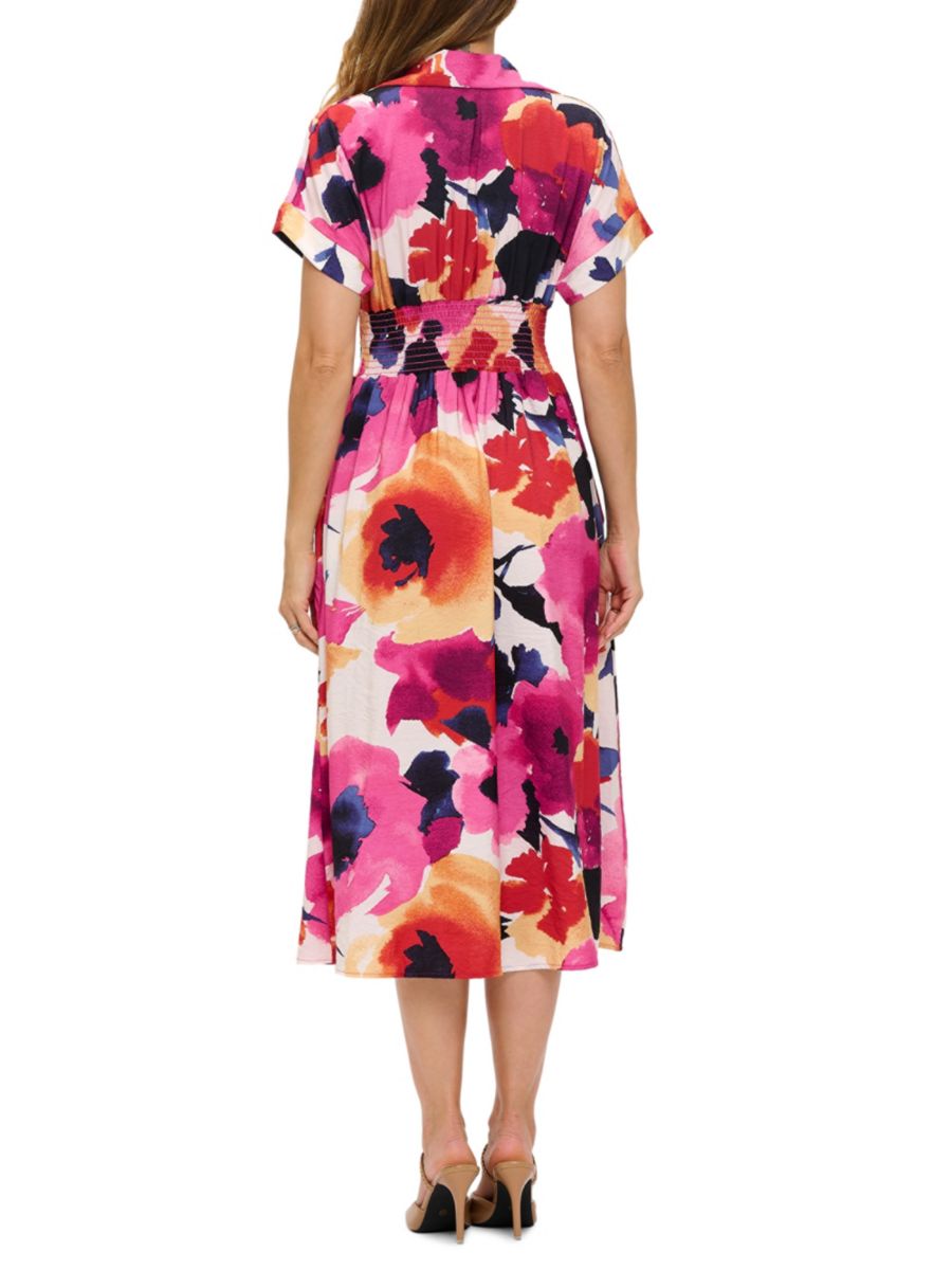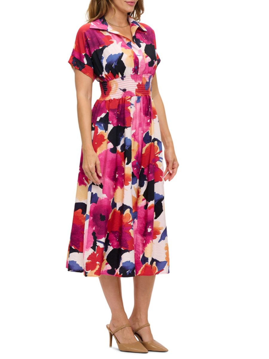 Это яркое платье миди от Renee C. выполнено из лёгкой ткани с ярким абстрактным цветочным принтом. Отложной воротник и короткие рукава уравновешивают присборенную талию и мягкую плиссировку на юбке.
