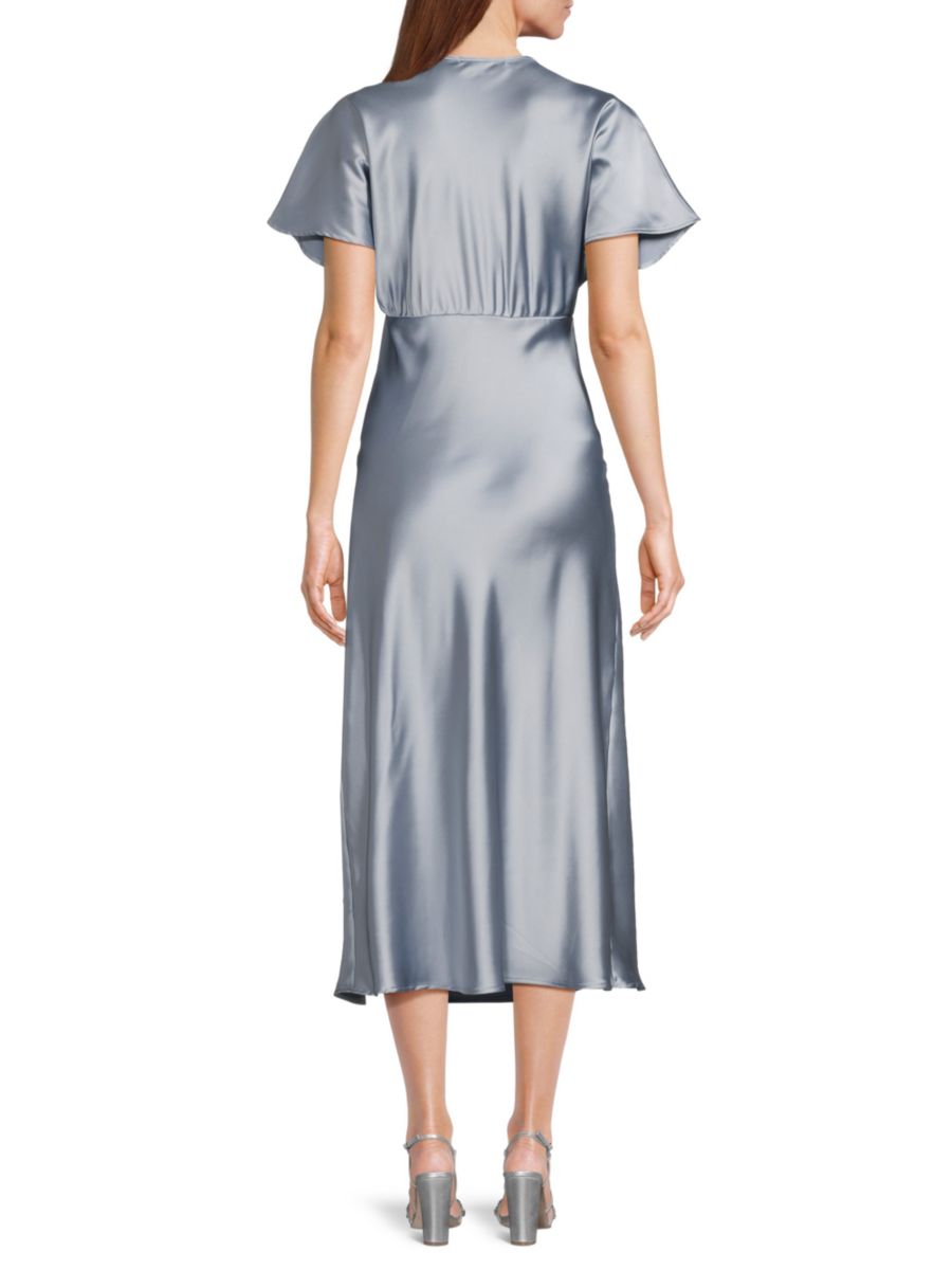 Гладкая атласная отделка придаёт элегантный вид этому шикарному платью миди с разрезом спереди.