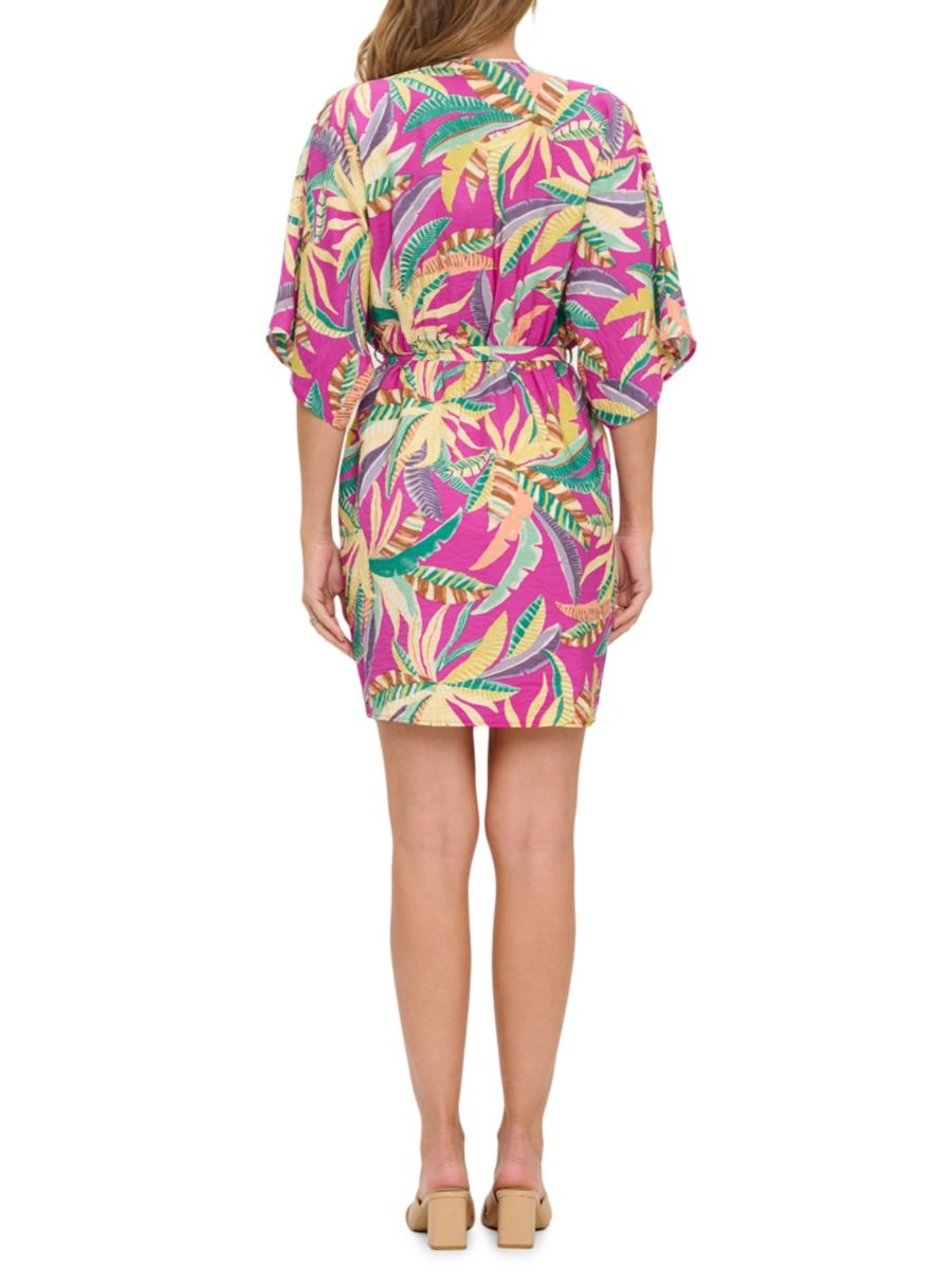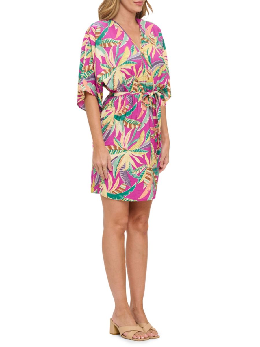 Мини-платье Renee C. с тропическим принтом имеет вырез с запахом, рукава до локтя и пояс на талии, что выгодно подчеркивает фигуру.