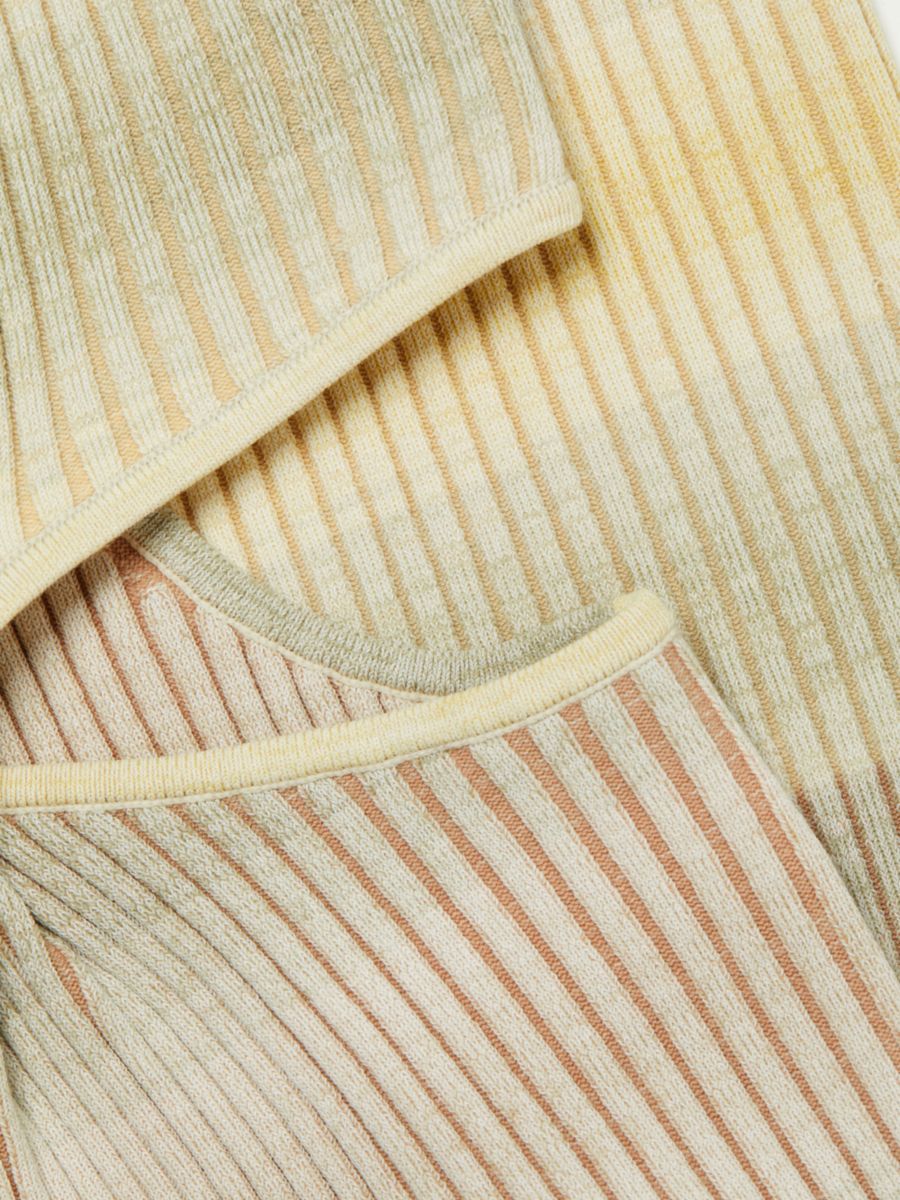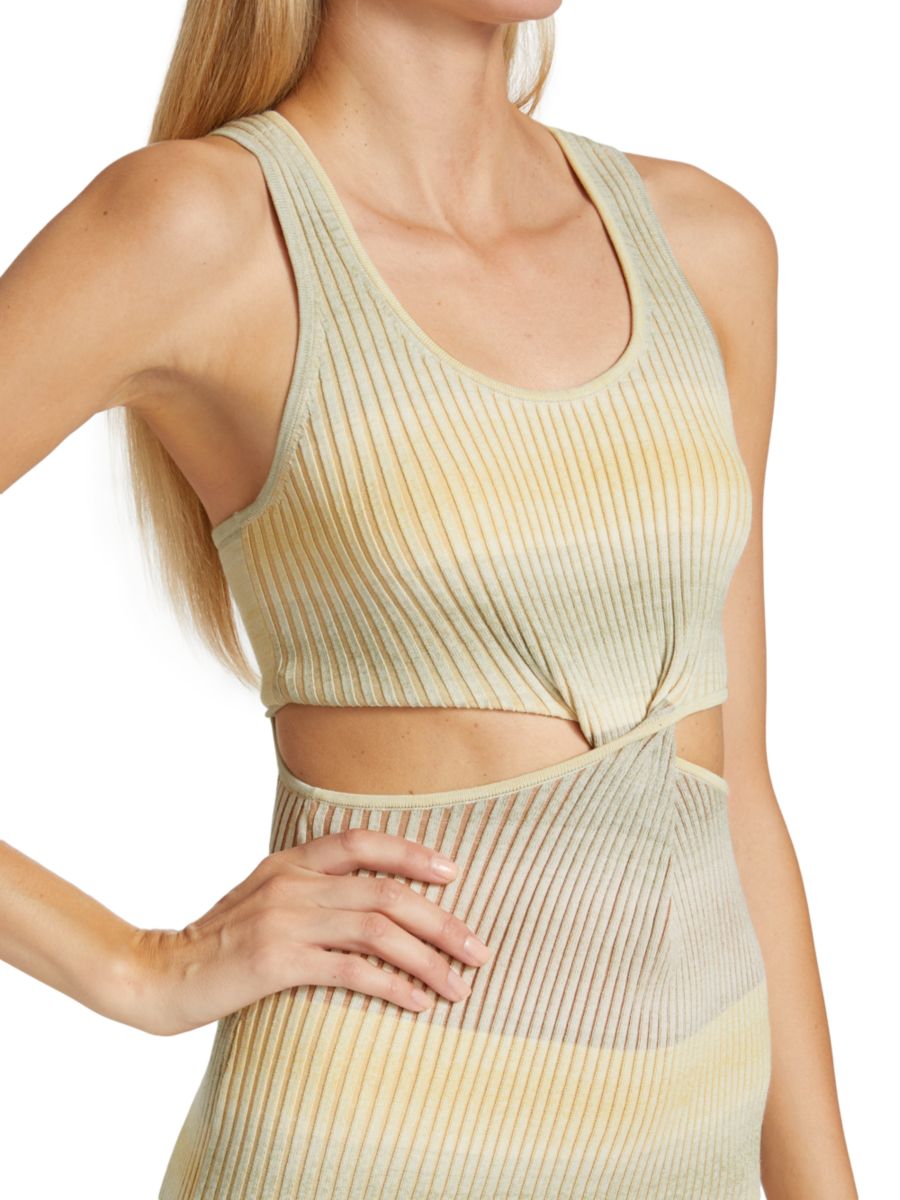 Облегающее платье без рукавов в рубчик с объемным скрученным передом и вырезом на талии.