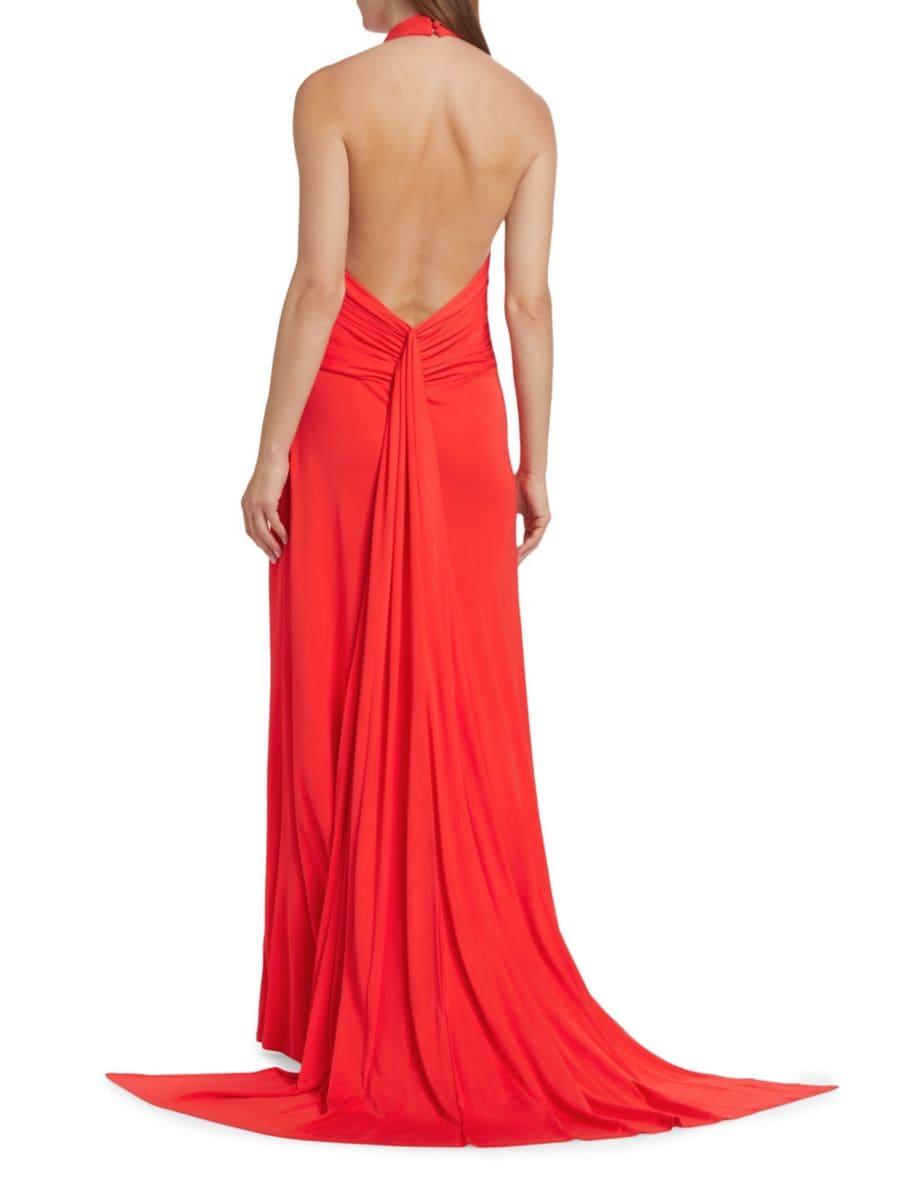 Платье Julius от Staud подчёркивает соблазнительный силуэт благодаря халтеру, боковому разрезу и открытой спине. Небольшой шлейф завершает этот эффектный дизайн.