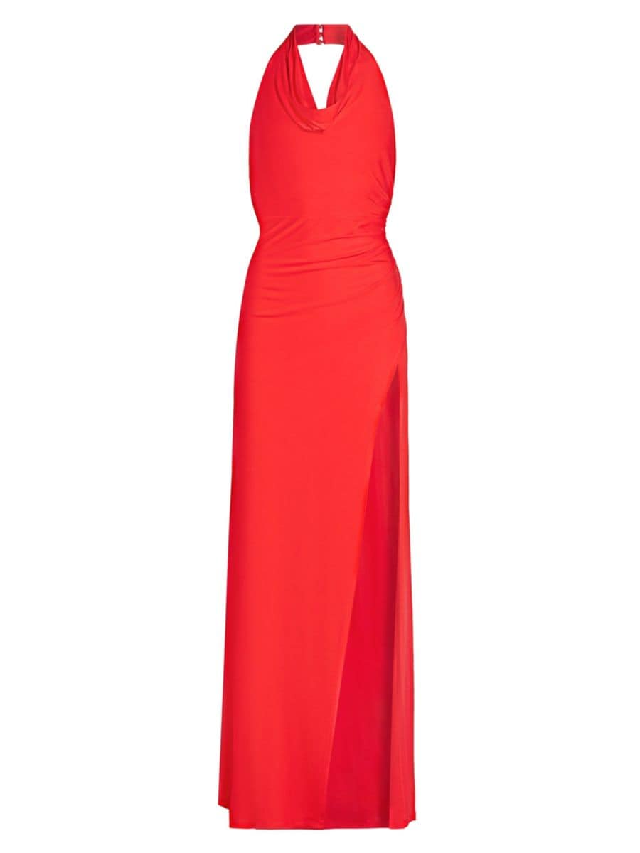 Платье Julius от Staud подчёркивает соблазнительный силуэт благодаря халтеру, боковому разрезу и открытой спине. Небольшой шлейф завершает этот эффектный дизайн.