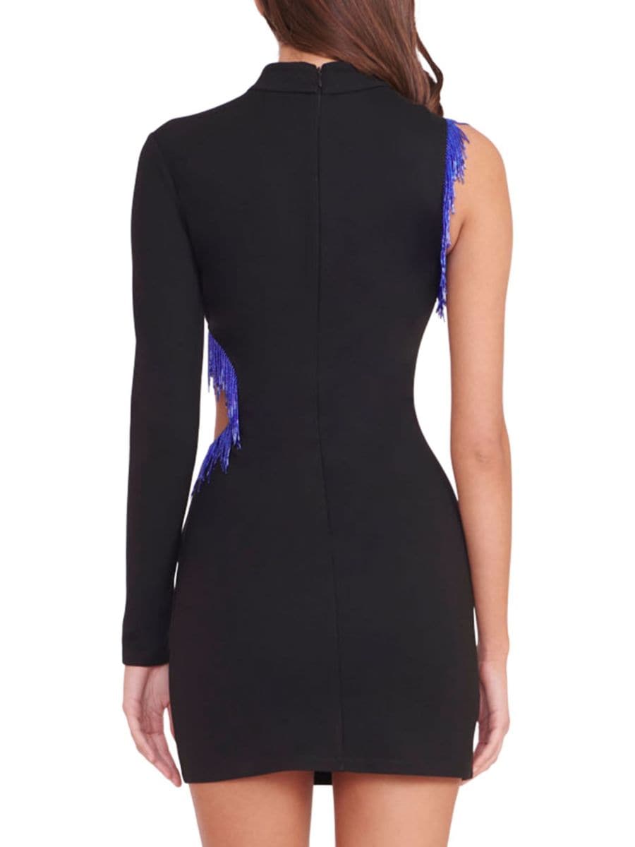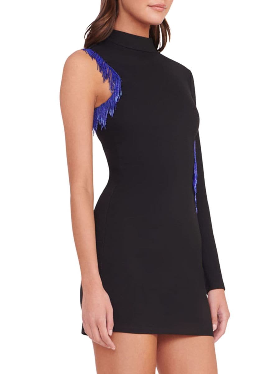 ЭКСКЛЮЗИВНО В SAKS OFF FIFTH. Мини-платье Kirsten от STAUD дополнено структурированной водолазкой и одним длинным рукавом. Платье А-силуэта дополнено отделкой бахромой из бисера на плече и боковом вырезе.