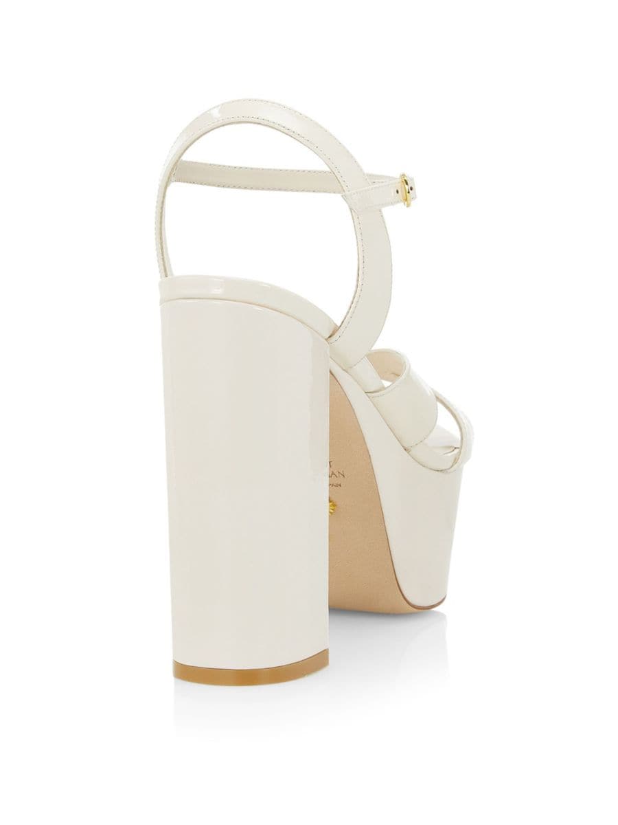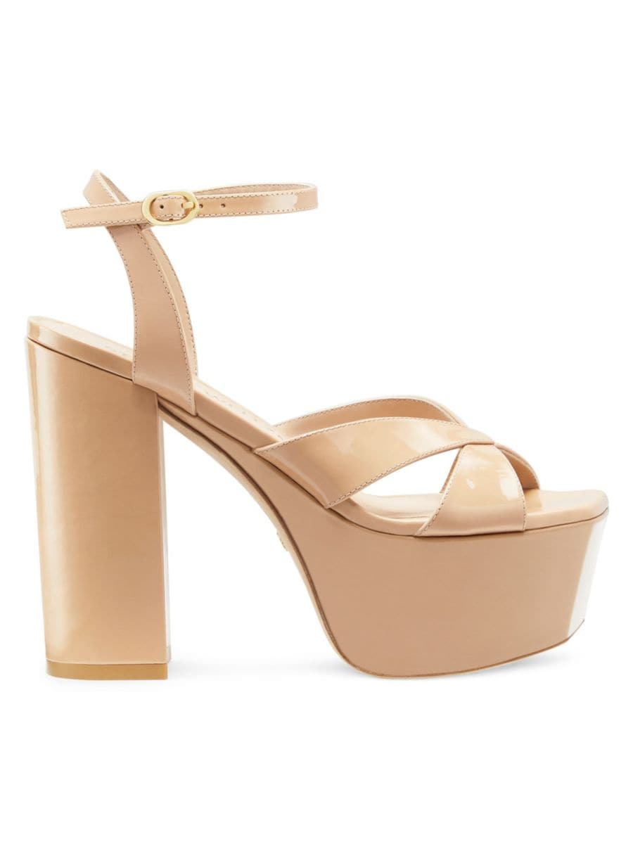 Эти лакированные босоножки от Stuart Weitzman с верхом из блестящей кожи и смелой платформой сочетают в себе ретро-стиль и современный шик.
