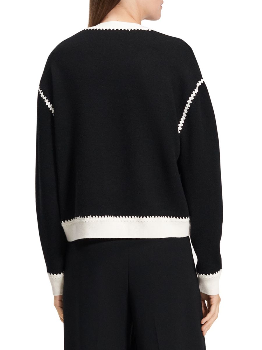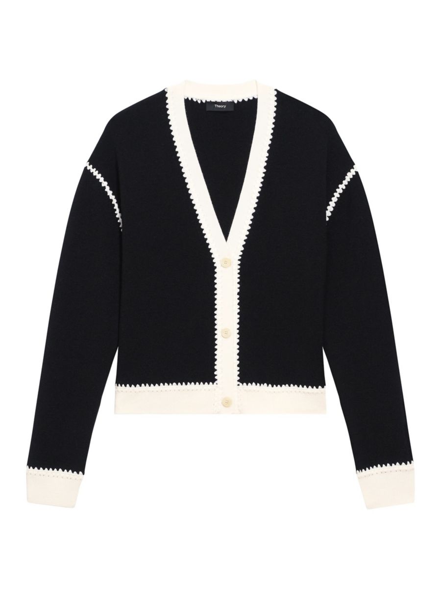 Кардиган Theory's Blanket выполнен из мягкой мериносовой шерсти, подчеркнутой отделкой в рубчик контрастного оттенка и краями в стиле пико.