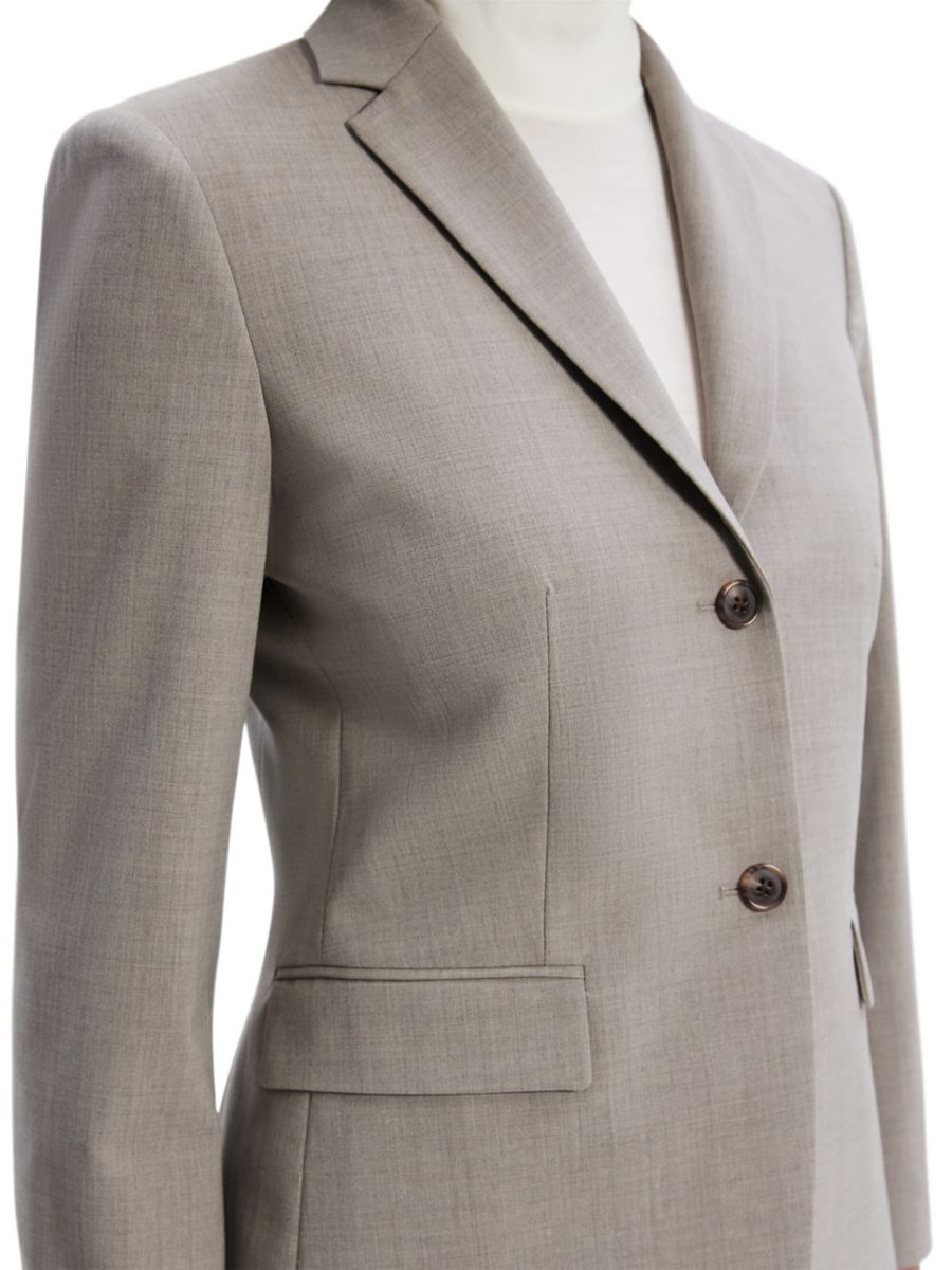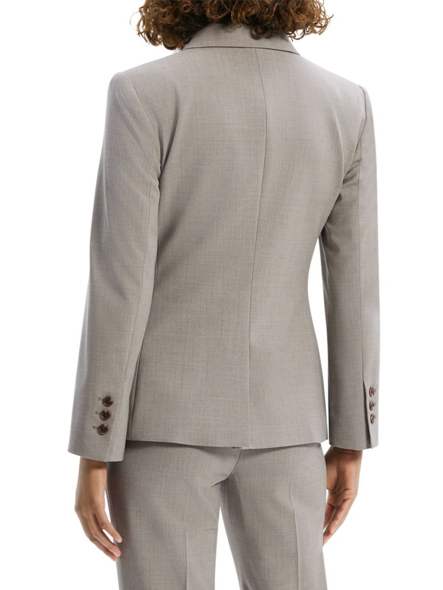 Лаконичный однобортный пиджак Theory на двух пуговицах с передними карманами выполнен в современном и изысканном стиле. Этот элегантный пиджак, выполненный из эластичной шерсти, дополнен вытачками для создания элегантного образа.