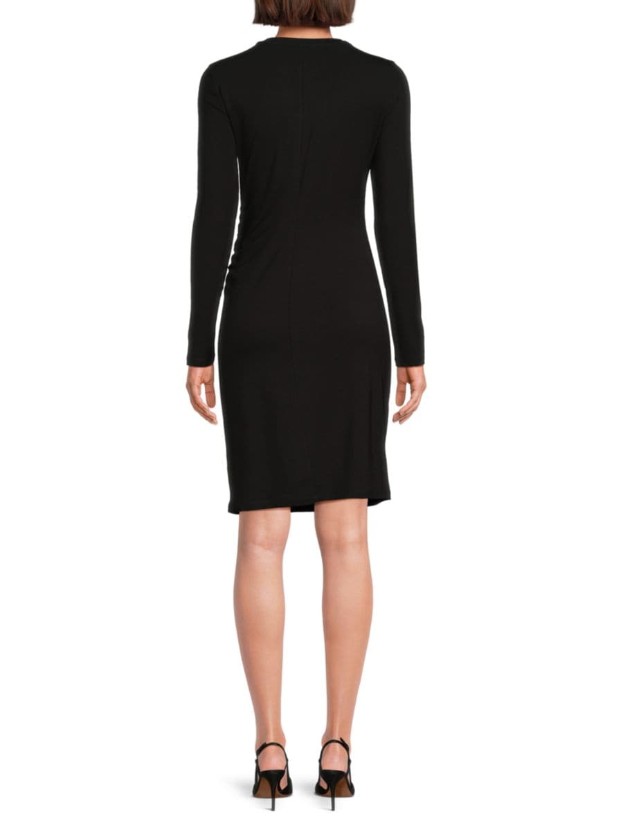 Платье Vince выполнено из мягкой смесовой вискозы с классическим круглым вырезом, длинными рукавами и присборенной талией, которая подчеркивает его облегающий силуэт.