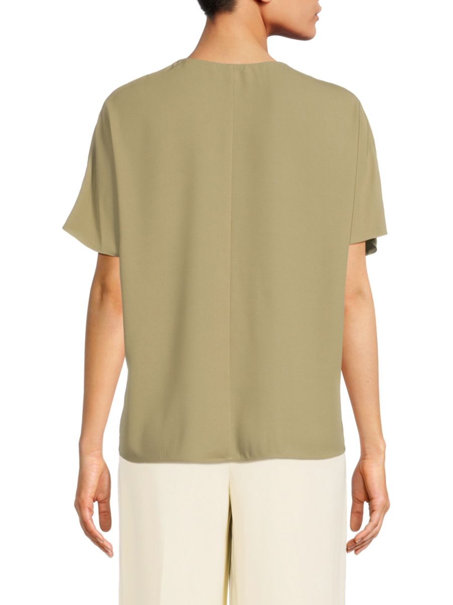 Однотонный топ Винса с вырезом-сюрпризом и короткими рукавами отлично подходит для создания стильных минималистичных образов.