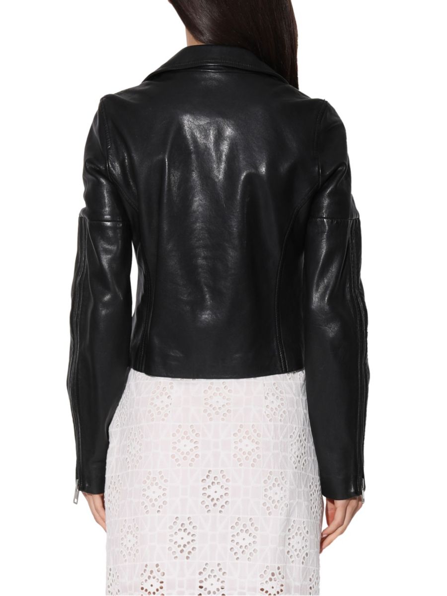 Куртка Presley от Walter Baker с открытыми молниями на рукавах и коротким силуэтом выглядит классически стильно. Изготовлена из гладкой кожи ягнёнка и имеет асимметричную застёжку.