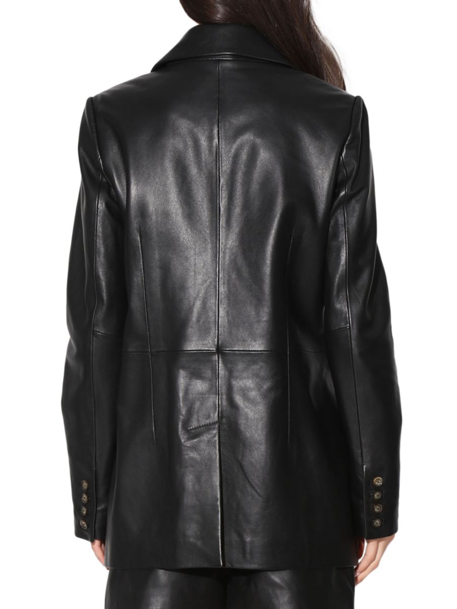 Двубортный кожаный блейзер Walter Baker с отложным воротником и длинными рукавами создаёт изысканный классический образ. Передние карманы на талии и прочная кожаная конструкция создают структурированный, свободный силуэт.
