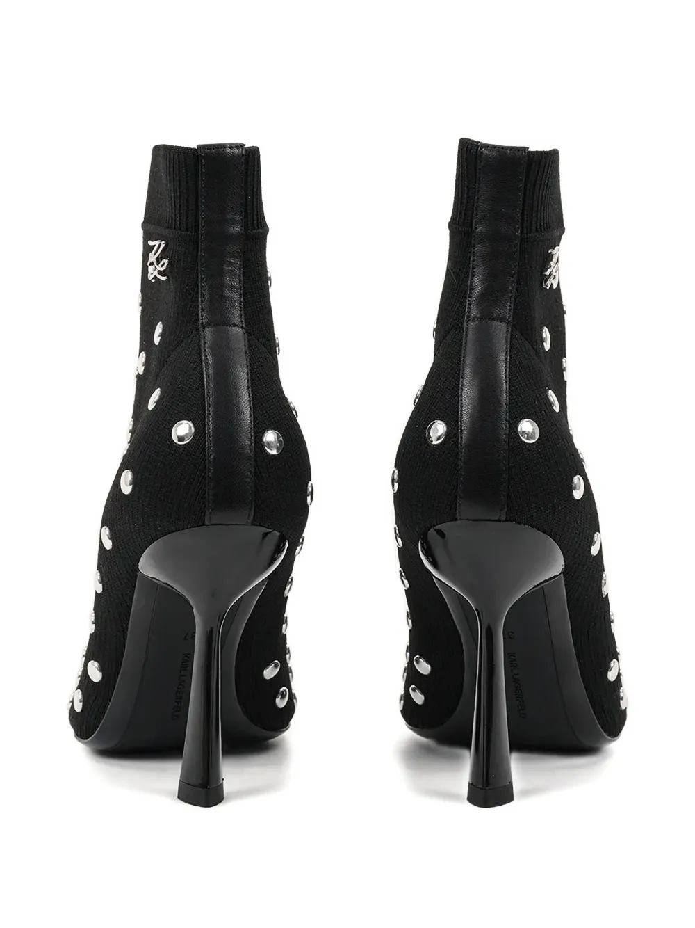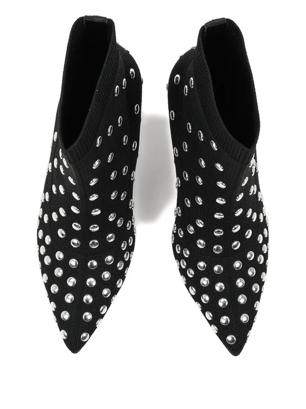 Черная отделка заклепками, острый носок, каблук-шпилька, трикотажное полотно