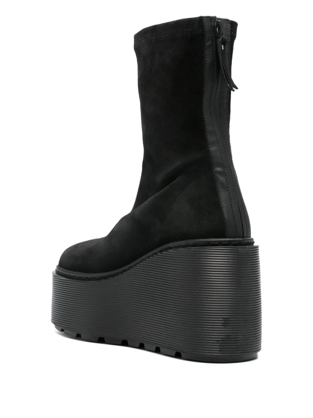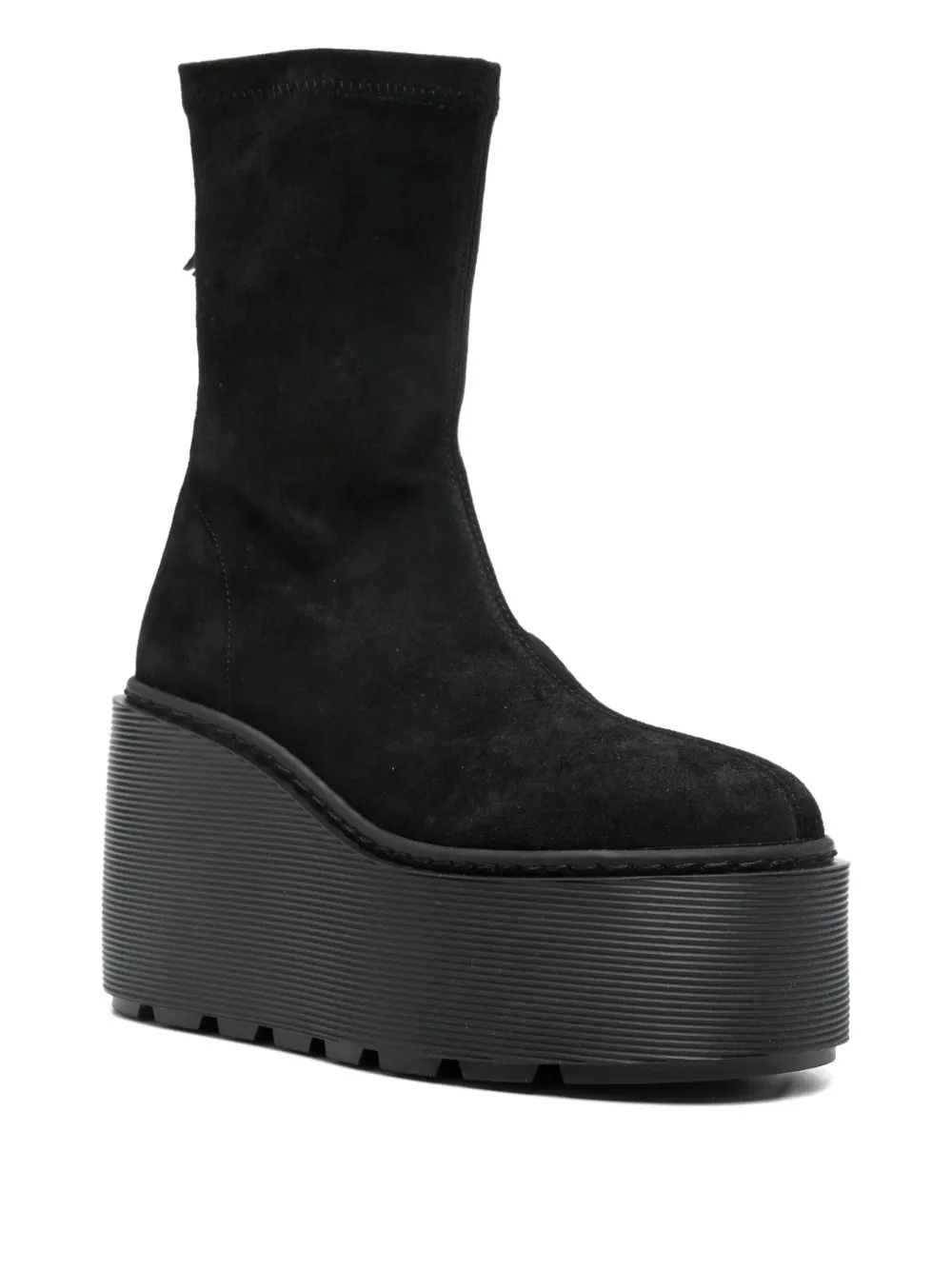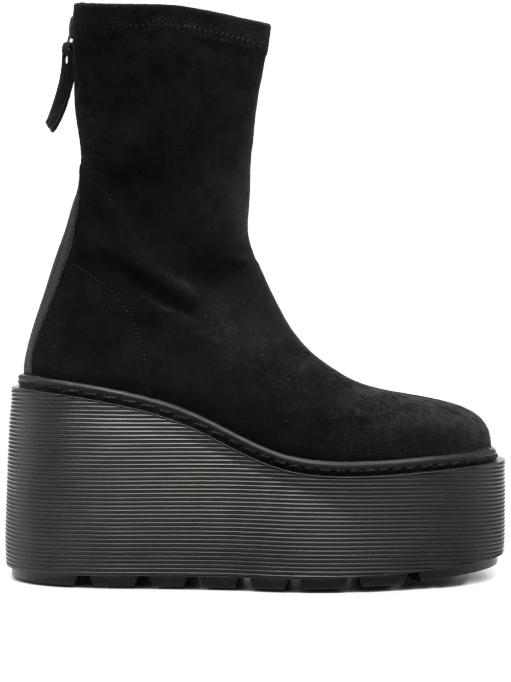 Верх из черной замши, платформа, застежка-молния, посадка по форме носка, круглый носок.