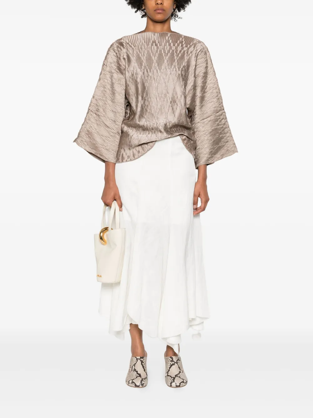 Светло-коричневая плиссированная фактура, квадратный вырез, короткие рукава, широкие рукава, прямой подол.