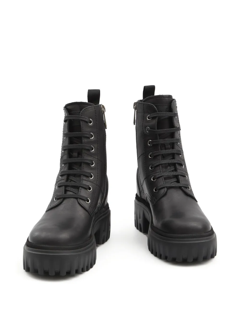 Верх из черной кожи, шнуровка, застежка-молния сбоку, круглый носок, платформа.
