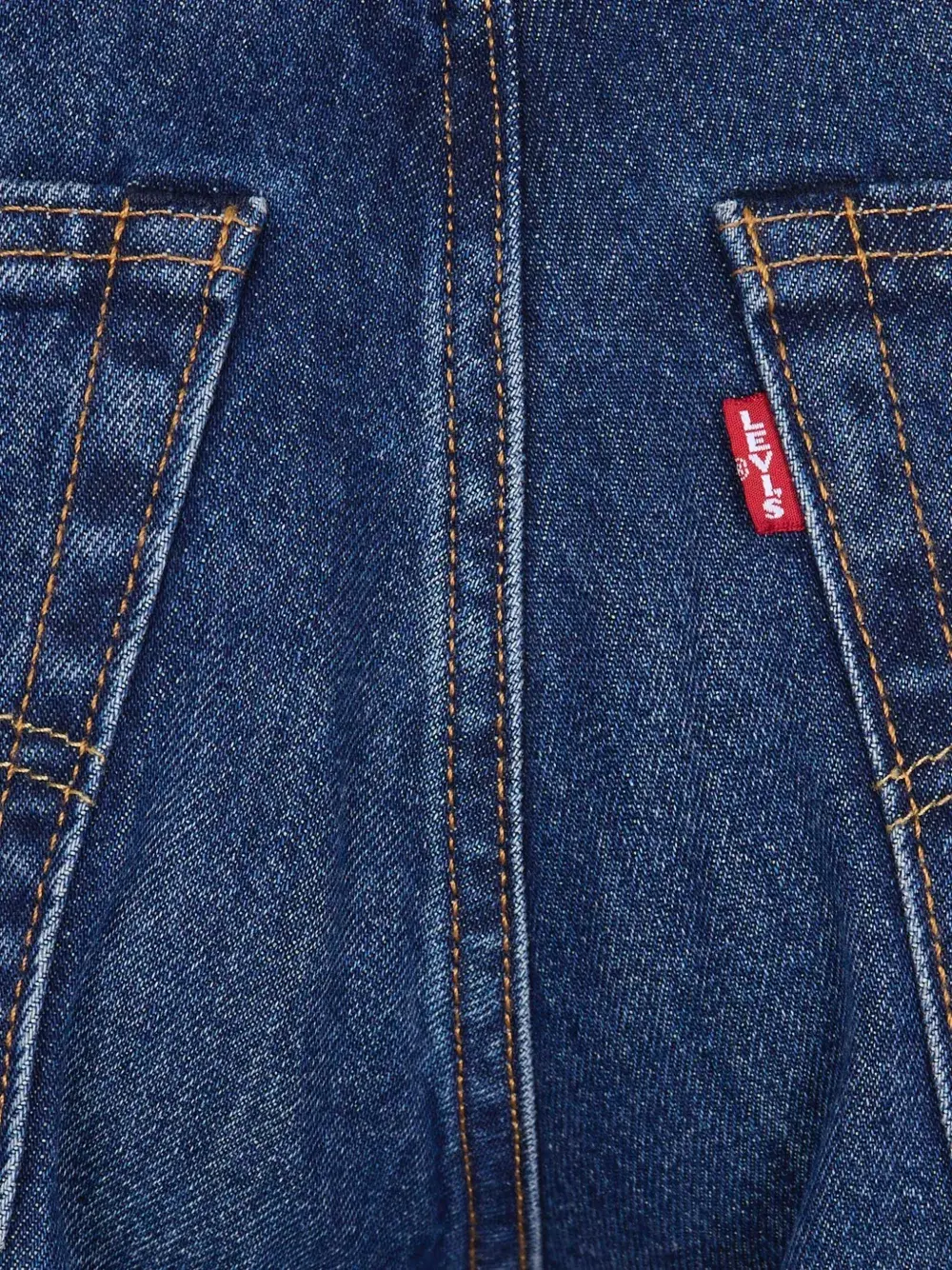 Классический дизайн с пятью карманами, синим хлопком, застежкой на пуговицы спереди, кожаными нашивками сзади и шлевками для ремня.