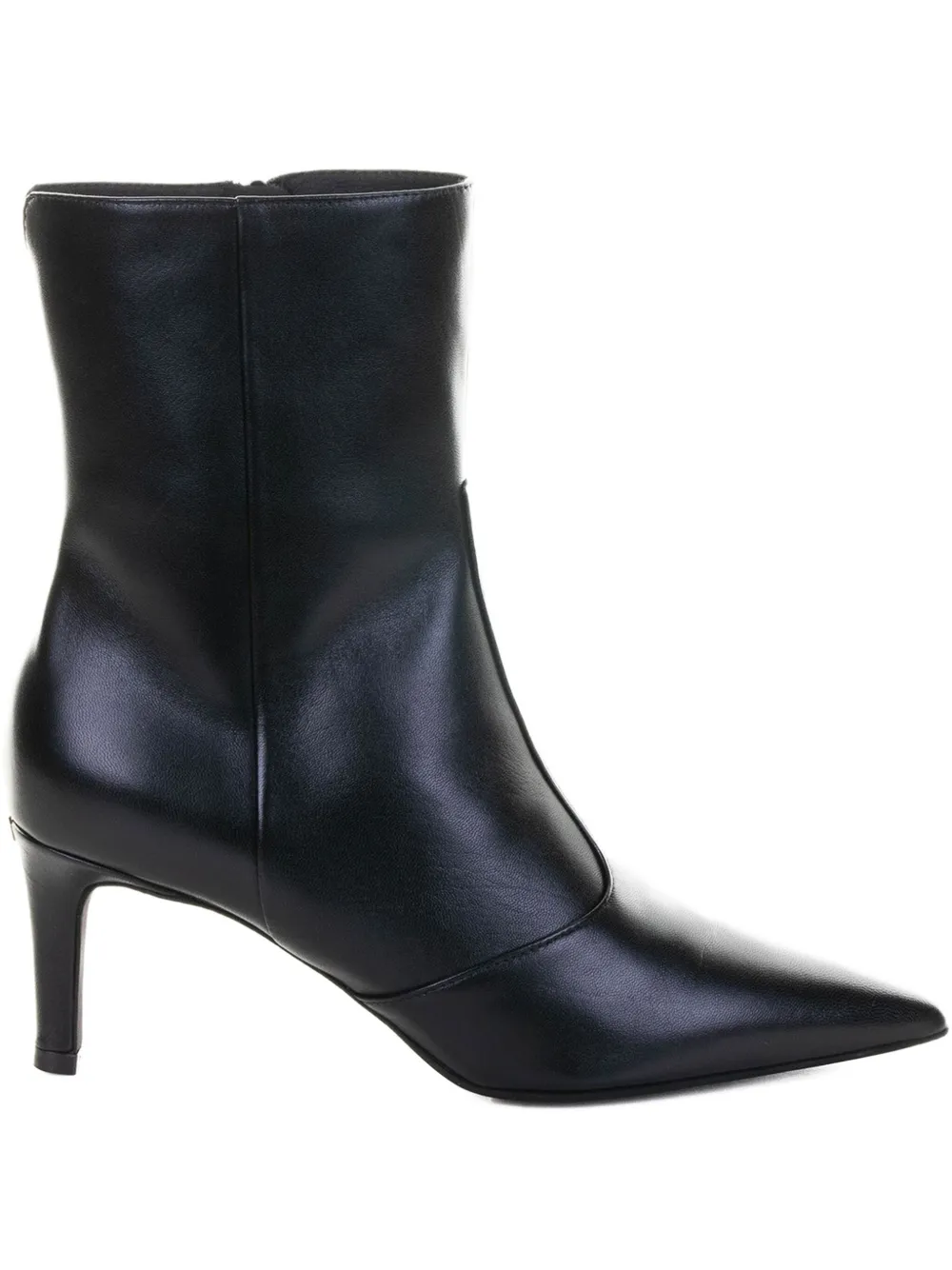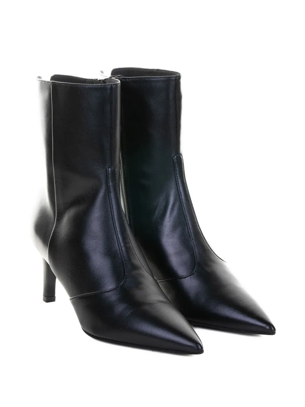 Черные кожаные туфли с острым носком и каблуком-шпилькой, застежка-молния сзади.