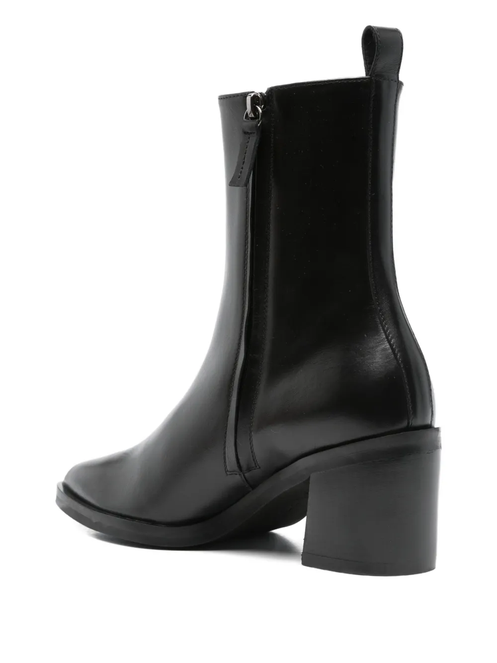 Туфли из черной телячьей кожи с острым носком, квадратным каблуком, застежкой-молнией сбоку, высотой до щиколотки.