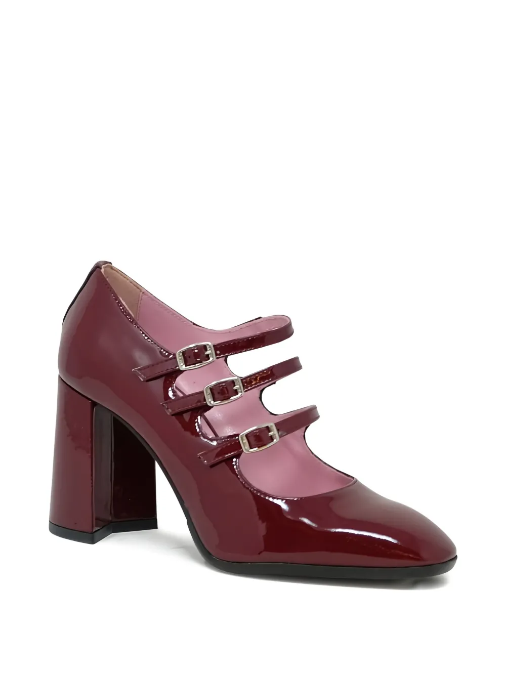 Туфли из бордовой лакированной кожи, блочный каблук, тройные пряжки, миндалевидный носок