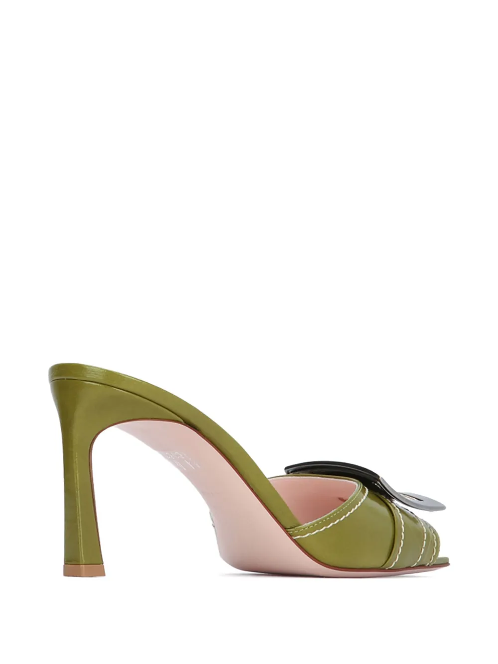 Туфли из зеленой кожи с отделкой швами и открытым носком на высоком каблуке.
