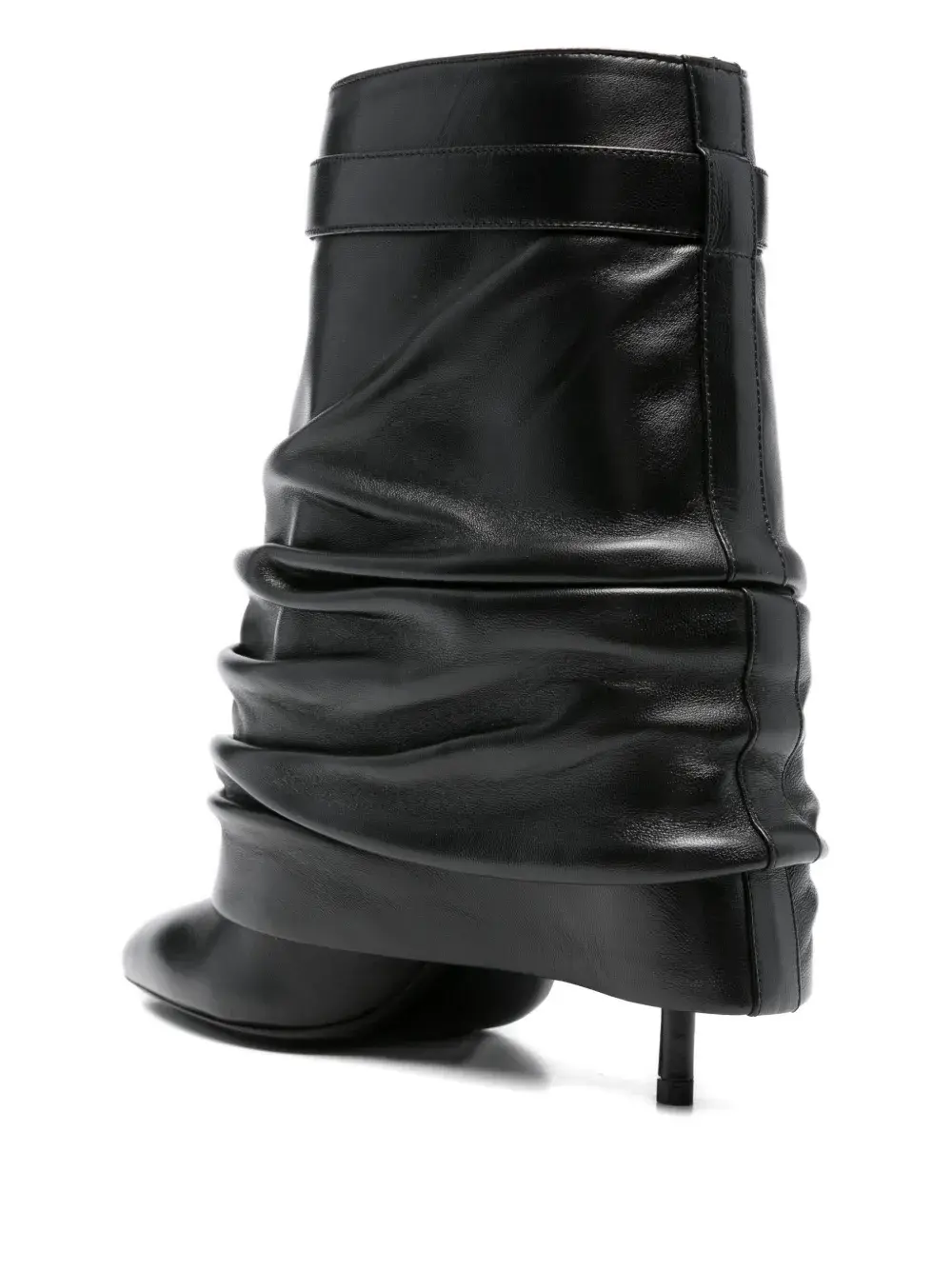 Черная телячья кожа, собранная в складки, заостренный носок, украшение в виде замка